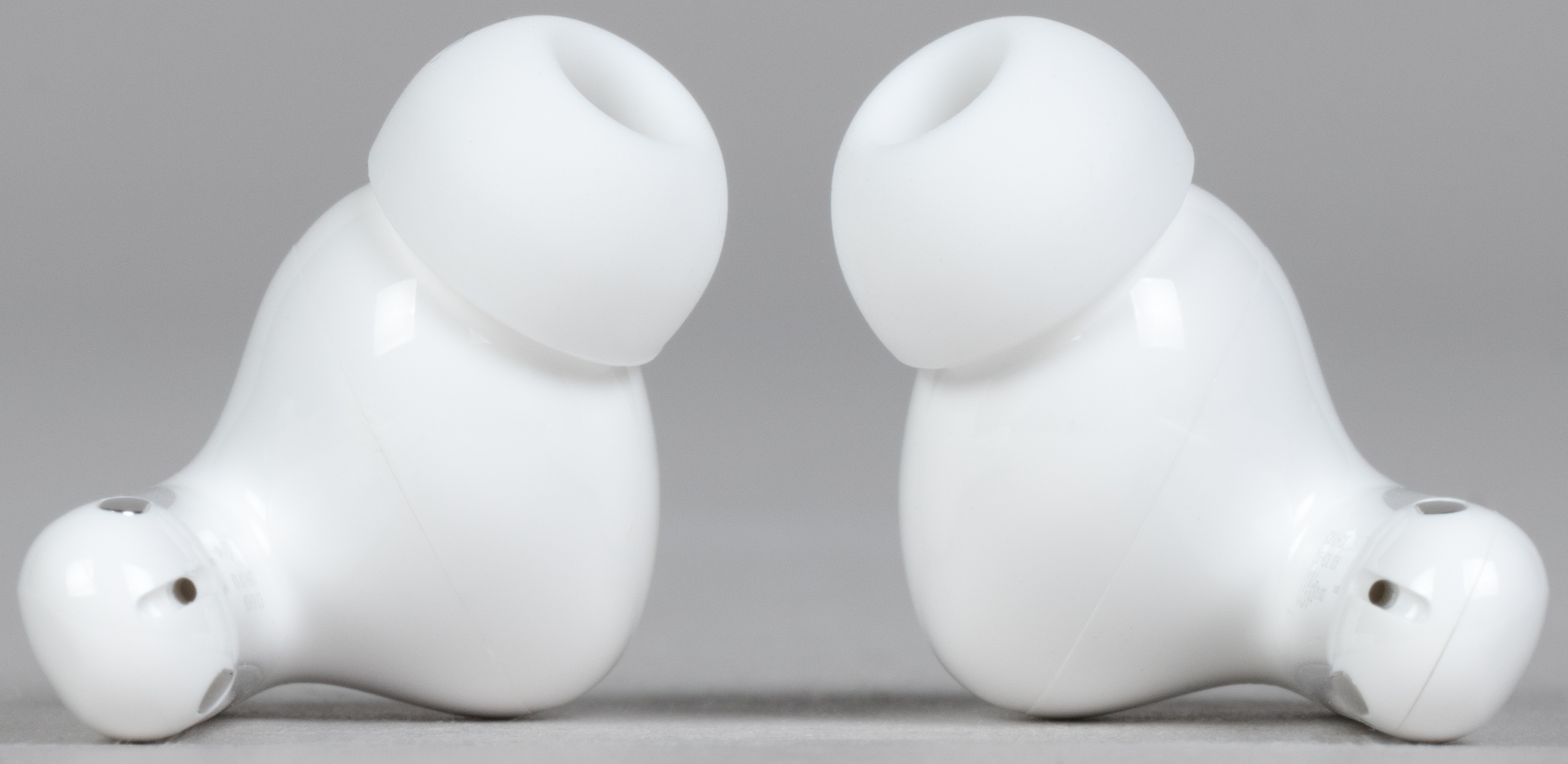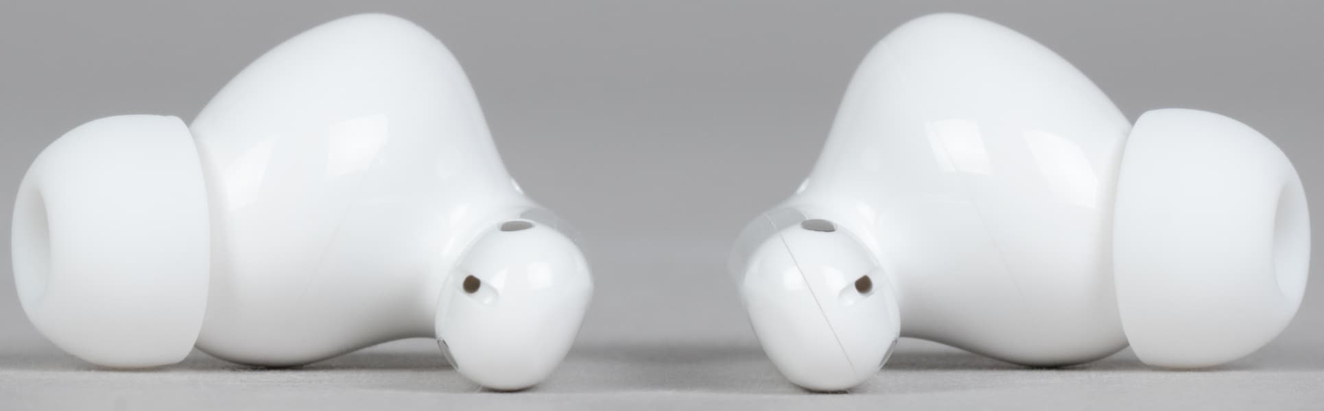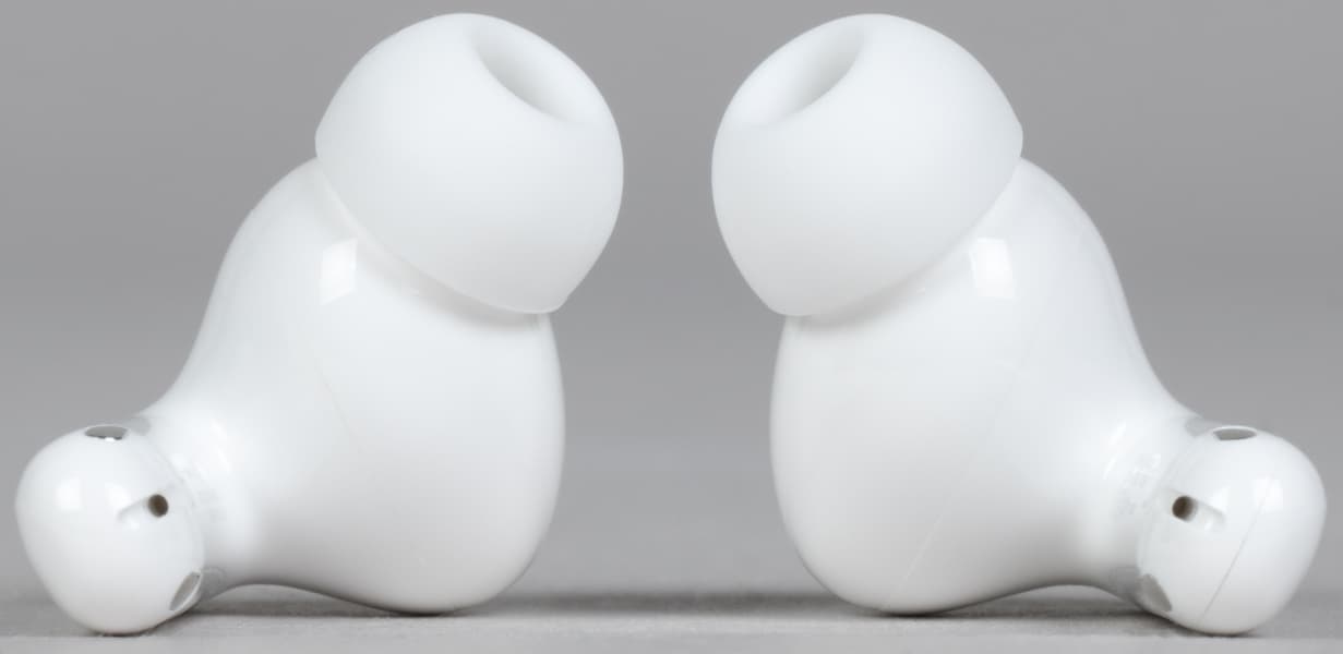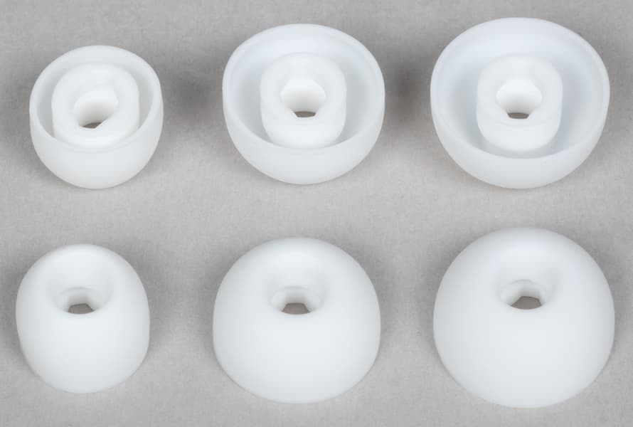 Силиконовые насадки удерживаются с помощью крупных выступов на концах звуководов. Держатся они надежно, снимаются сравнительно просто. А вот поставить их обратно бывает сложновато — хорошо, что регулярно это делать необходимости нет.