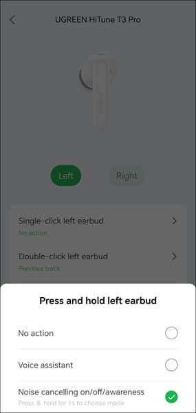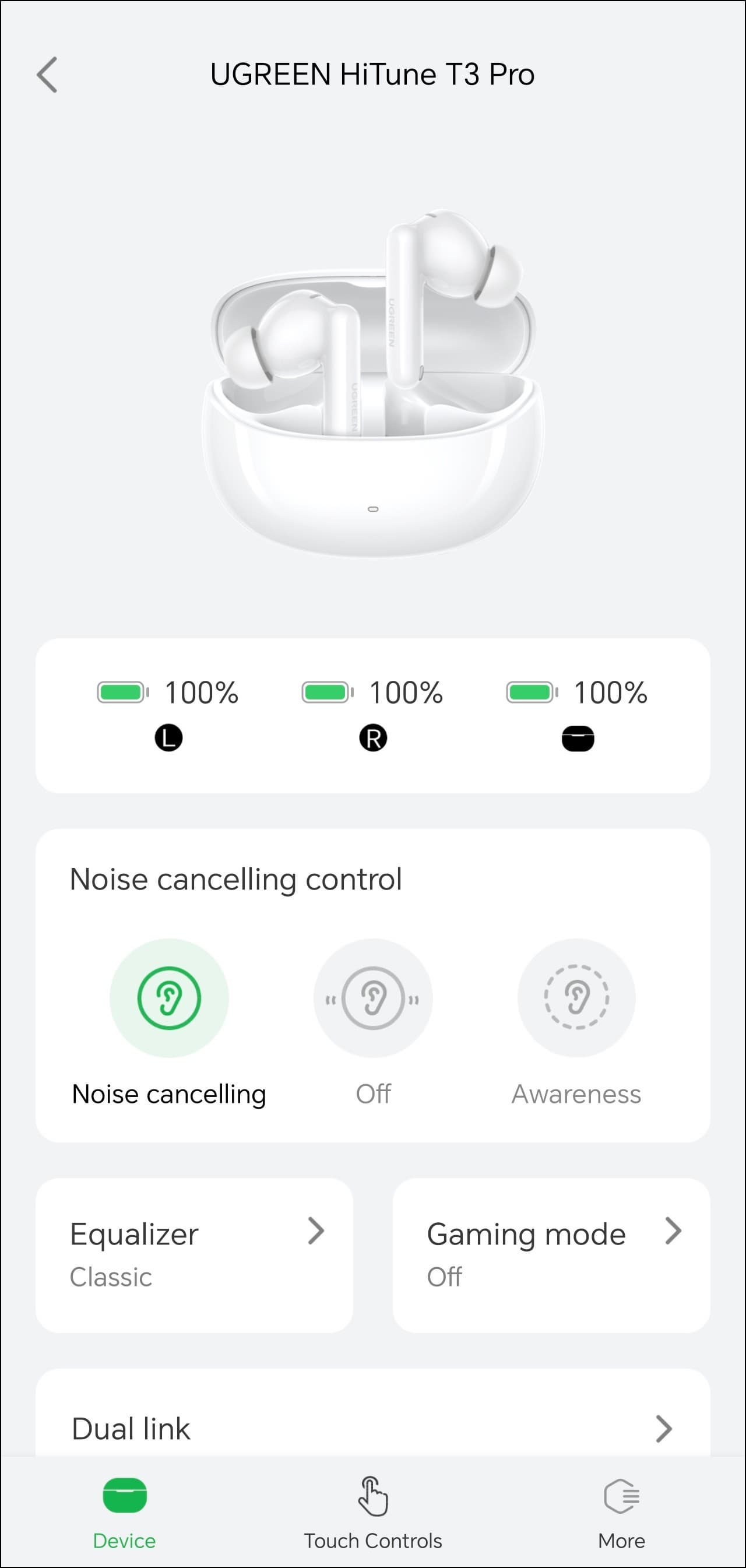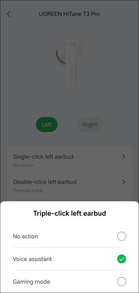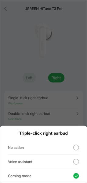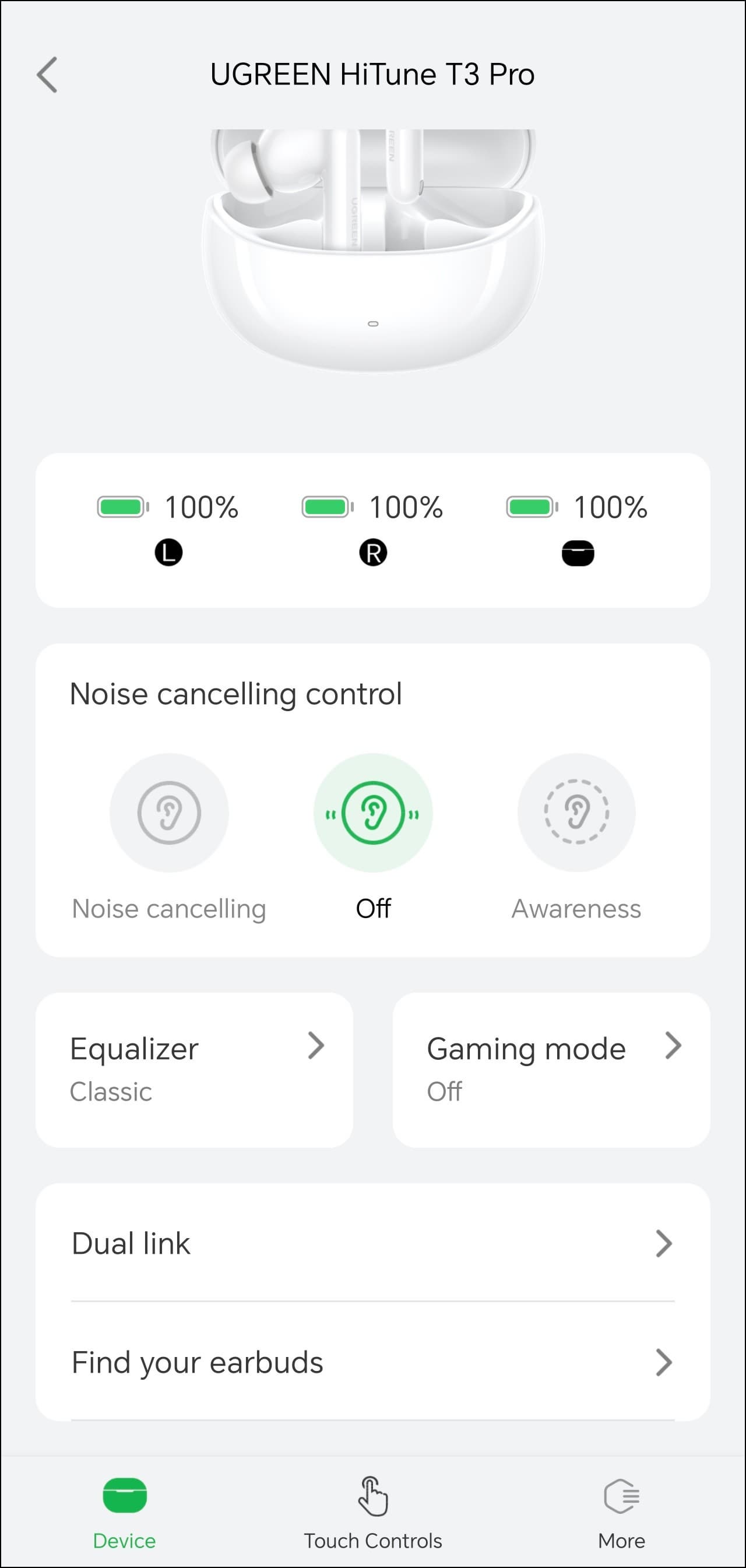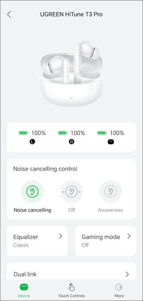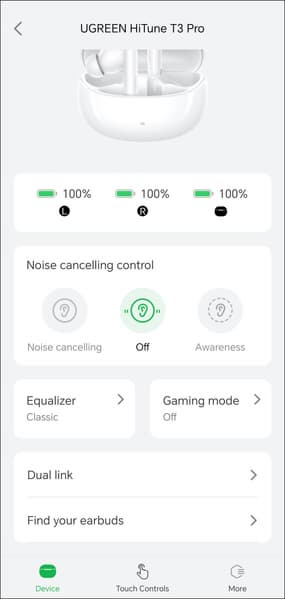 Управление гибко настраивается, система умеет отличать левый и правый наушники, на разные типы касаний можно «повесить» любые действия, включая изменение громкости — так бывает далеко не всегда, причем даже у гораздо более дорогих наушников, за это Ugreen HiTune T3 Pro стоит похвалить отдельно.