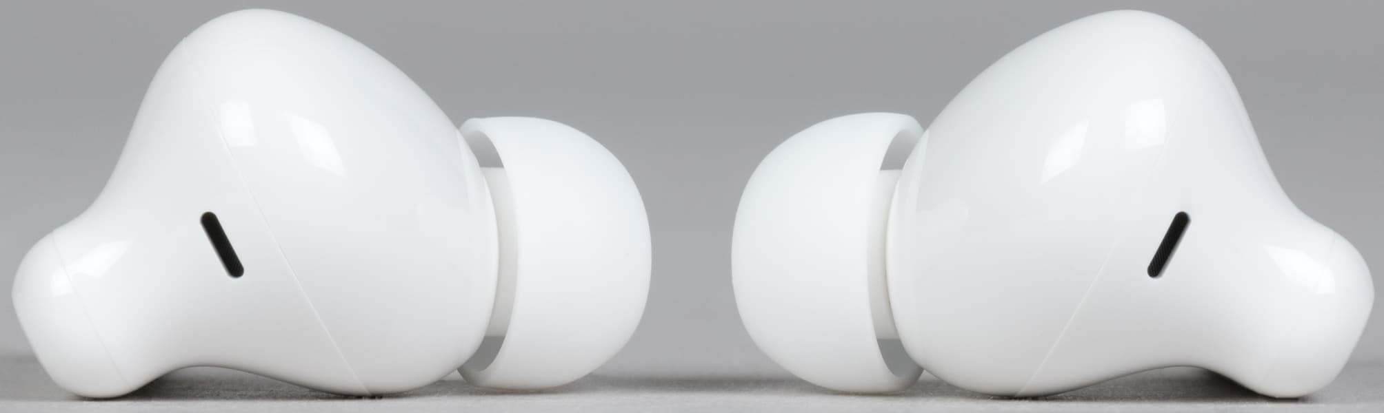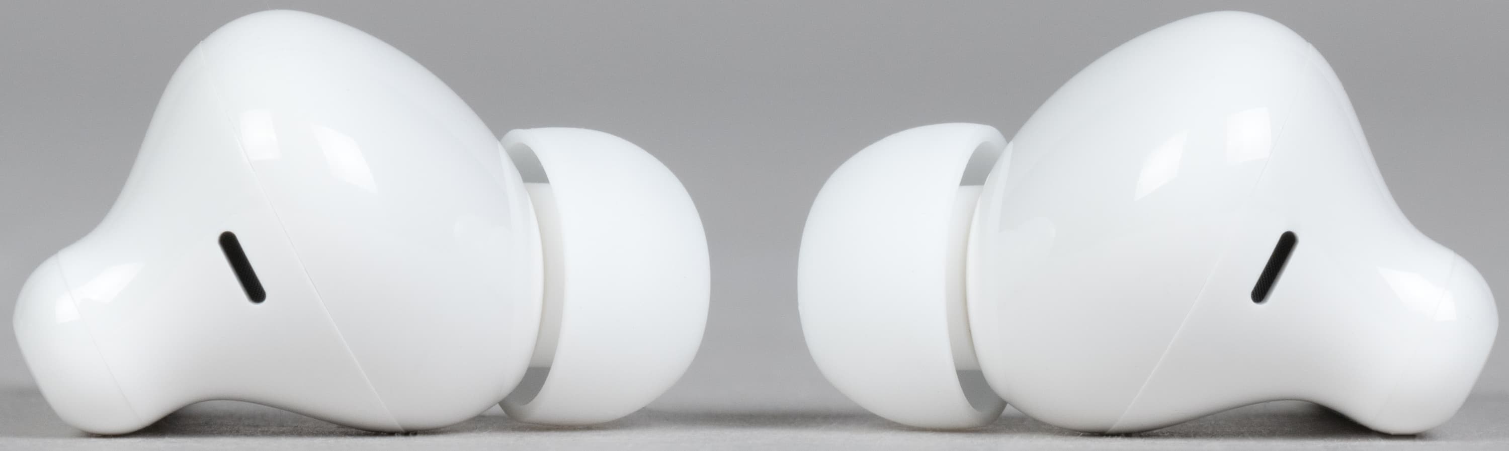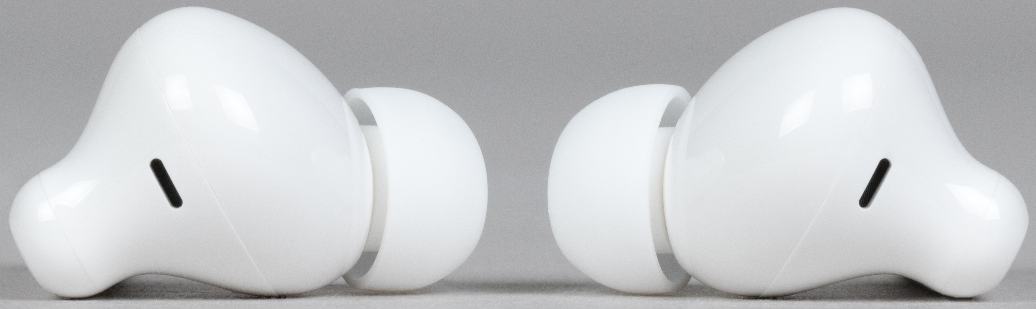 Отверстия микрофонов для голосовой связи немного смещены на внутреннюю сторону ножек, что вкупе со щелевидной формой дает пусть и небольшую, но защиту от «задувания» при использовании гарнитуры на ходу или в ветреную погоду.