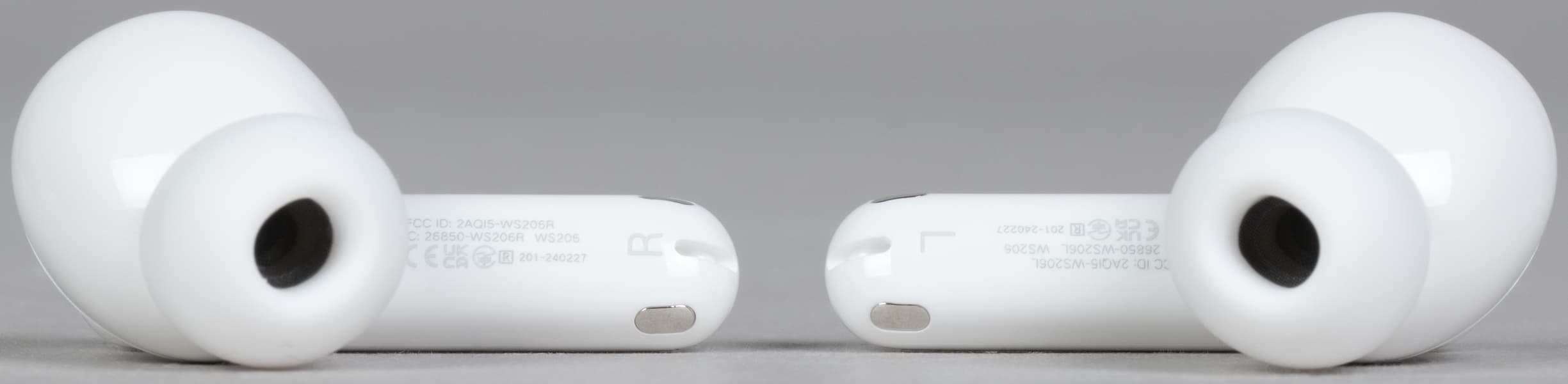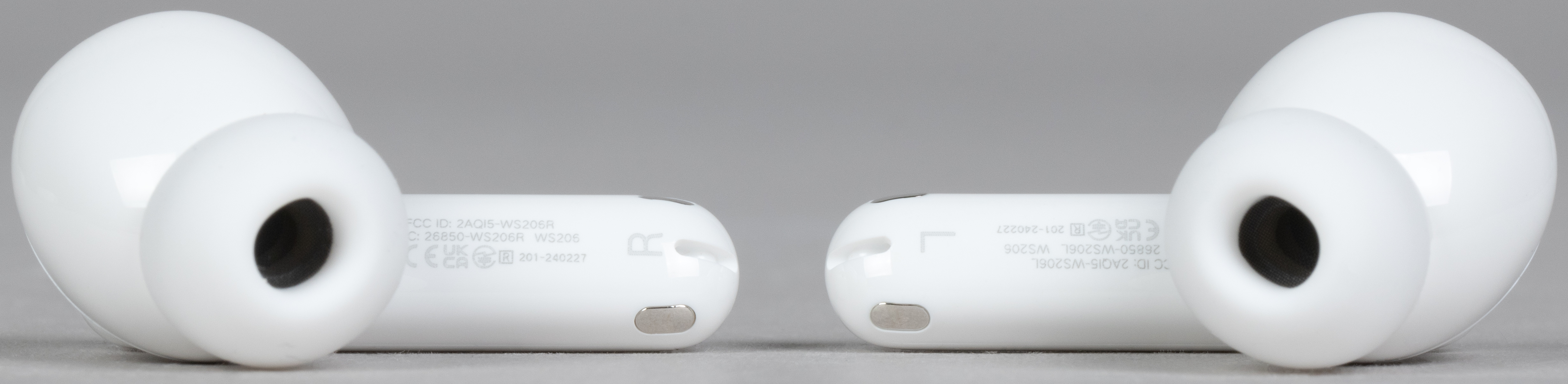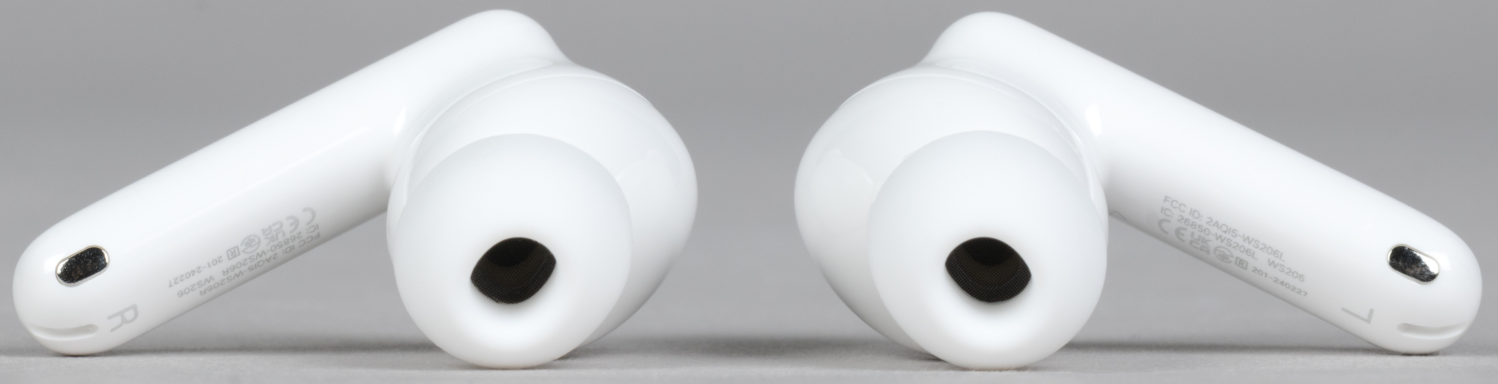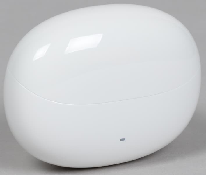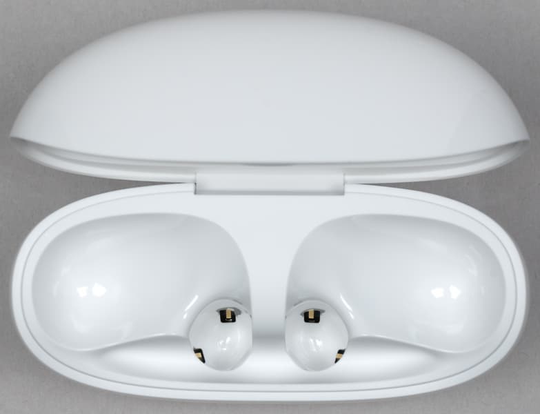 На торце ножек расположены контакты для зарядки, а также отверстия микрофонов для голосовой связи. Если приглядеться, там же можно заметить обозначения «правый»/«левый», но проще ориентироваться по форме наушников и их размещению внутри кейса.