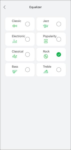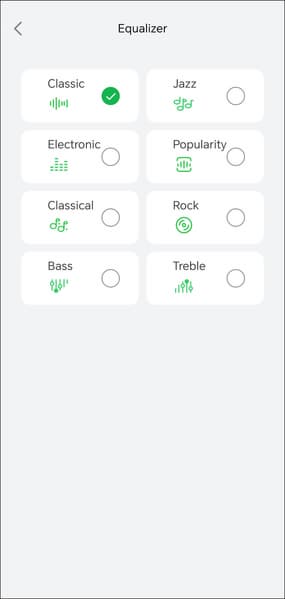 На главном экране можно увидеть уровень зарядки аккумулятора каждого из наушников, там же находится модуль управления системой шумоподавления. Изменения агрессивности его работы, как у Ugreen HiTune H6 Pro, тут не предусмотрено — «шумодав» можно только включить или выключить. Там же задействуется режим «звуковой прозрачности», в котором микрофоны гарнитуры транслируют окружающие звуки в динамики — пригодится, чтобы контролировать происходящее вокруг на прогулке или пробежке, например. Производитель вновь предлагает восемь пресетов встроенного эквалайзера, при этом возможности создавать свои не предусмотрено, что немножко жаль.