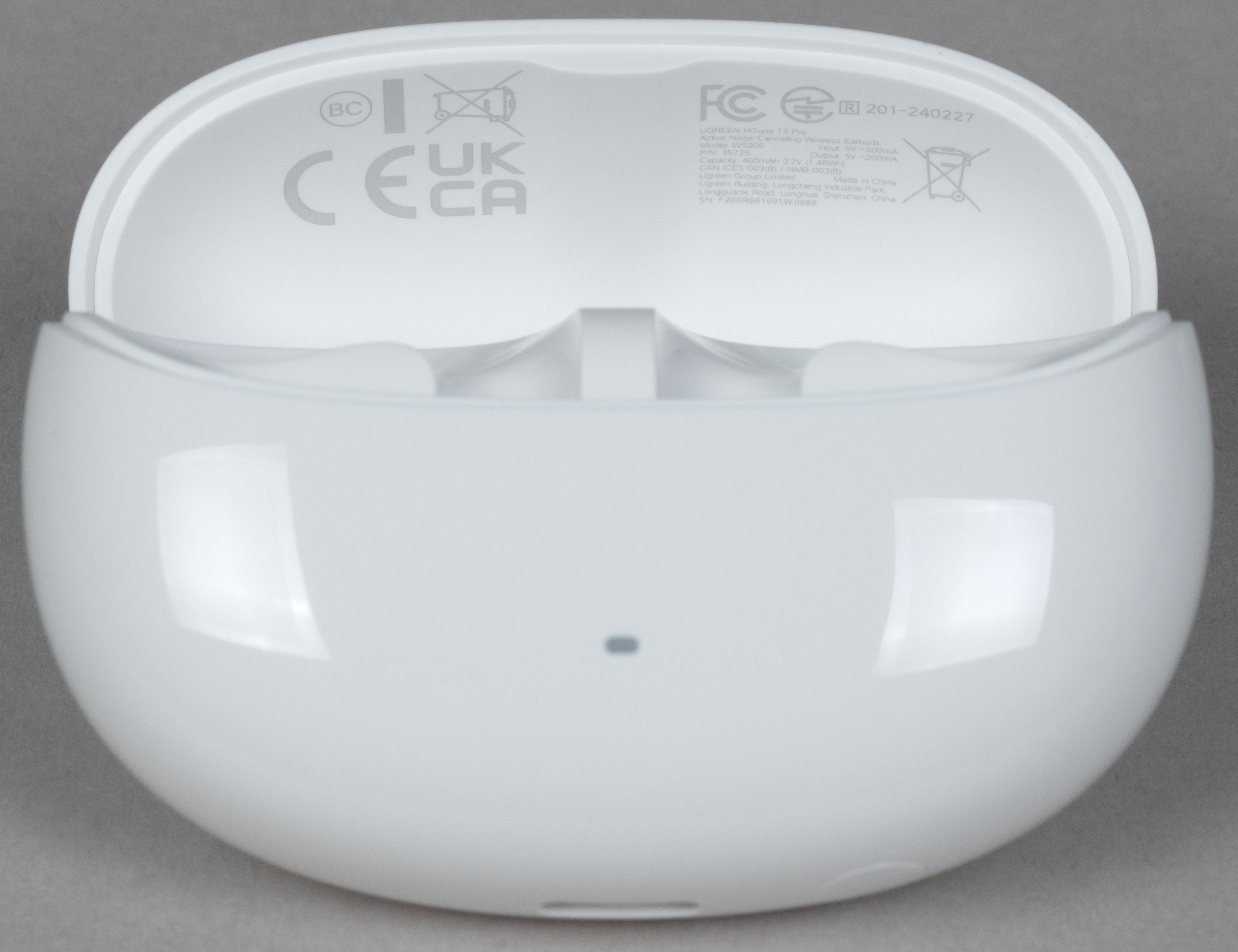 В нижней части корпуса кейса находится порт USB Type C для зарядки. На внутреннюю поверхность крышки нанесены краткая техническая информация, а также логотипы систем сертификации.