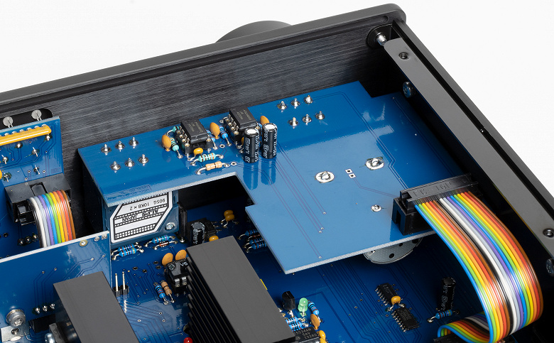 За регулировку громкости отвечает моторизованный потенциометр Alps RK27. Еще один такой же, но без мотора, производит изменение баланса. Работает потенциометр прекрасно, но для особо страждущих доступна модификация устройства под названием Violectric DHA V590 Pro, где громкость изменяется с помощью 256-ступенчатого набора сопротивлений с релейным переключением.