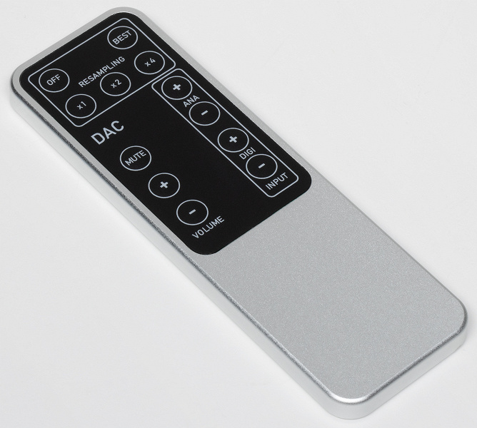 Как уже отмечалось выше, корпус пульта выполнен из металла, выглядит он очень надежно и солидно. Кнопки нажимаются с приятным кликом, но чуть-чуть туговаты — к ним придется немного привыкнуть. В верхней части доступны управление питанием и быстрый выбор любого из режимов ресемплинга. В середине находятся кнопки выбора входов, регулировки громкости и отключения звука.
