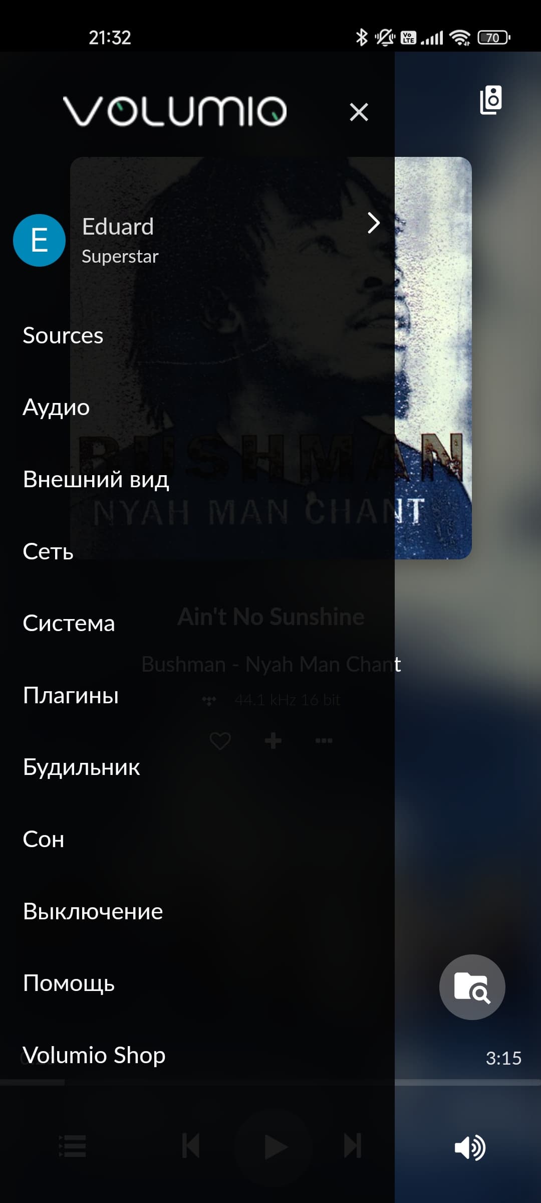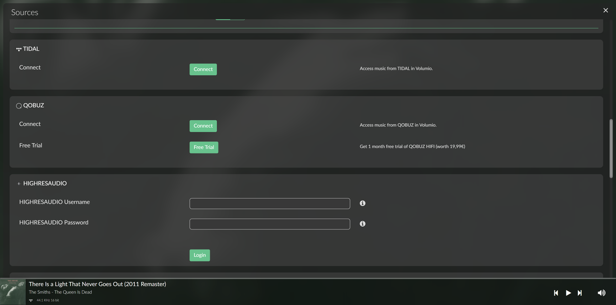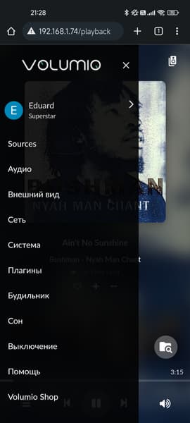 Ну а далее переходим в браузер — видим интерфейс управления, то бишь то самое ПО Volumio, с которого все и начиналось. Сориентироваться просто — все элементы расположены логично, перевод на русский язык кое-где кривоват, но присутствует… К нам плеер приехал уже настроенным кем-то из коллег, разлогиниваться мы не стали — дающий ряд описанных выше преимуществ статус Superstar привязывается к аккаунту. Активируется он с помощью кода на купоне, который идет в комплекте.