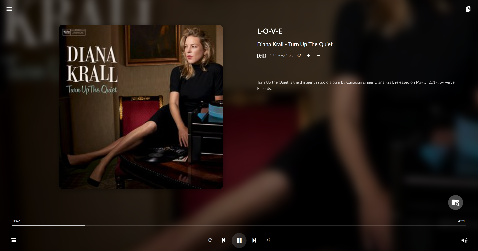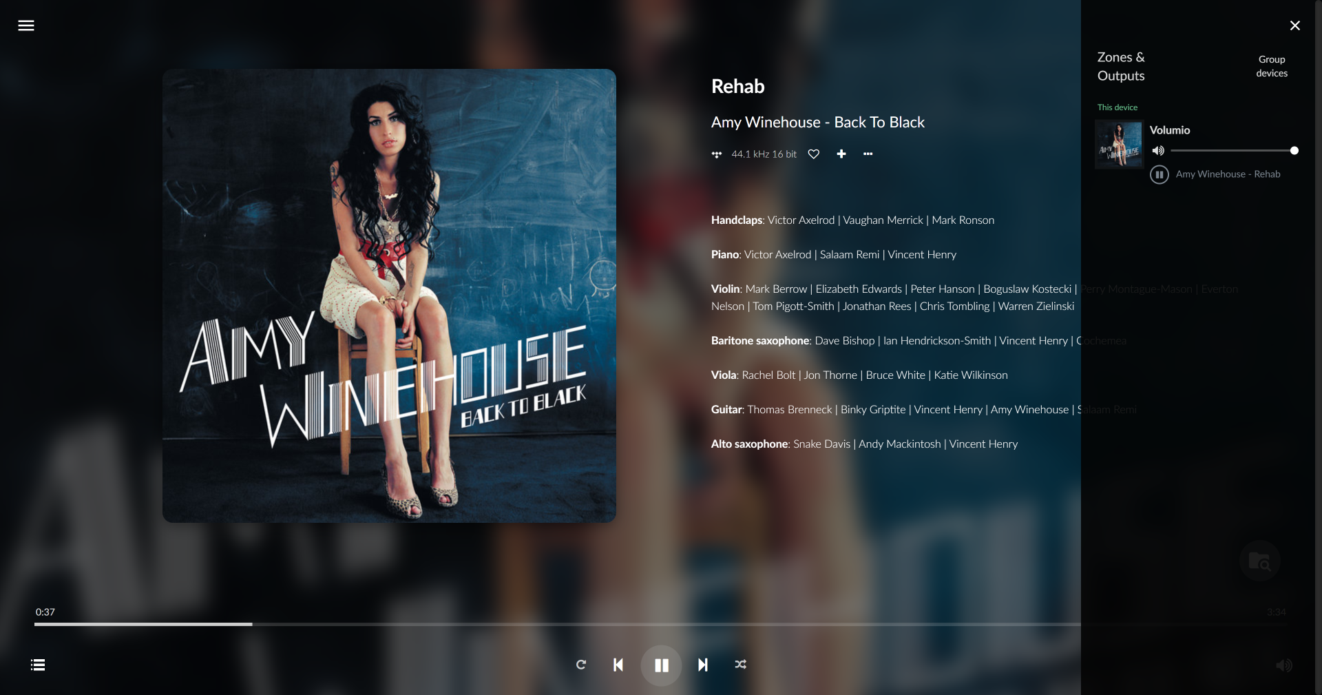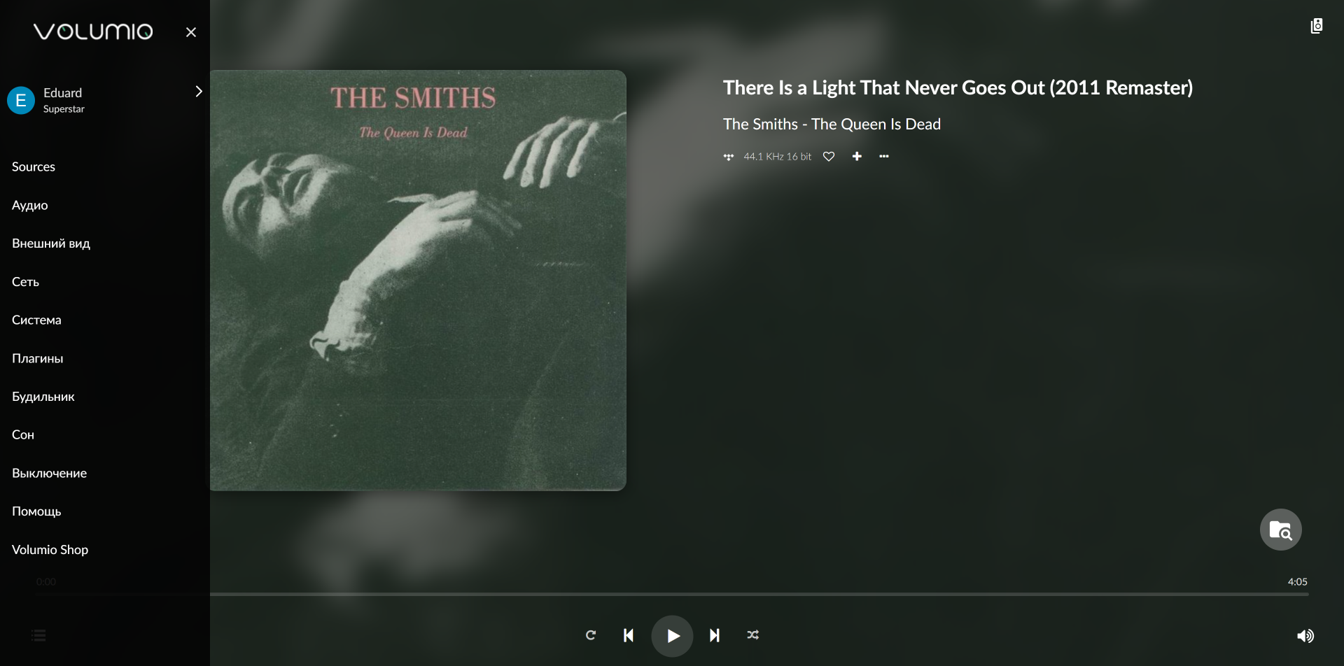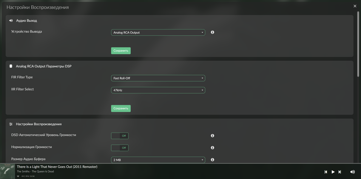 На экране проигрываемого трека демонстрируются информация о нем, обложка и данные об авторах. В правой колонке можно открыть настройки мультирума, управление воспроизведением размещено снизу.