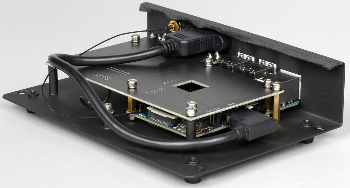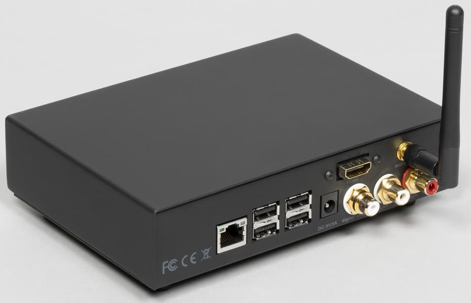 Непосредственно микрокомпьютер и аудиочасть представляют собой две отдельные платы, размещенные друг над другом и соединенные через шлейф. В расположенной сверху аудиоплате сделан квадратный вырез, служащий для отвода тепла от размещенного ниже радиатора охлаждения процессора. Решение, возможно, не самое элегантное, но вполне рабочее — с заметным нагревом устройства за все время его тестирования мы не столкнулись ни разу.