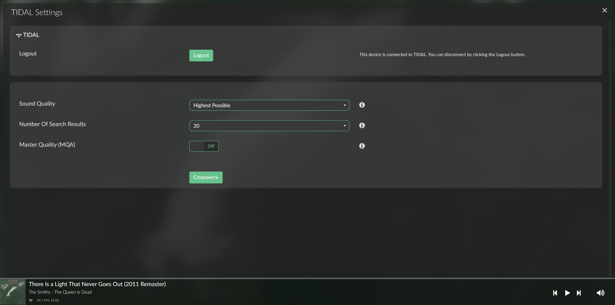 В настройках работы с сервисом можно выбрать уровень качества потока, количество результатов поиска, а также включить или выключить поддержку MQA.