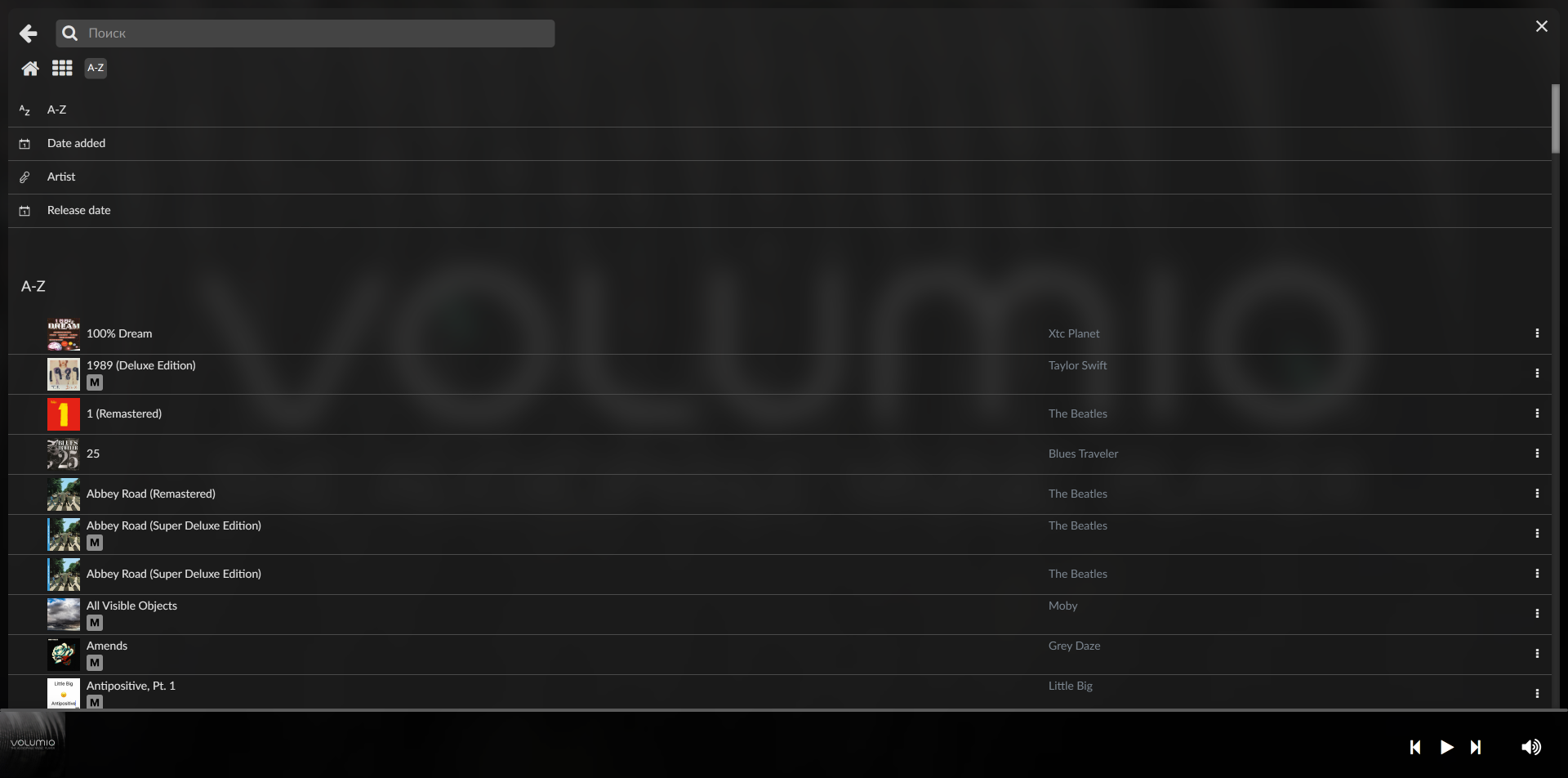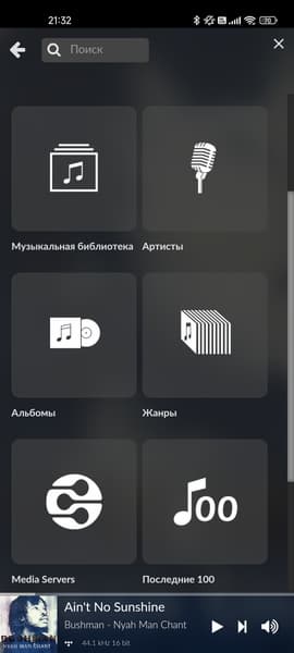Ну и на этом первоначальную настройку можно считать законченной — переходим к использованию. Вся добавленная музыка группируется по альбому, артисту и так далее — естественно, если у файлов корректно прописаны тэги. На той же странице доступен выбор онлайн-источников.