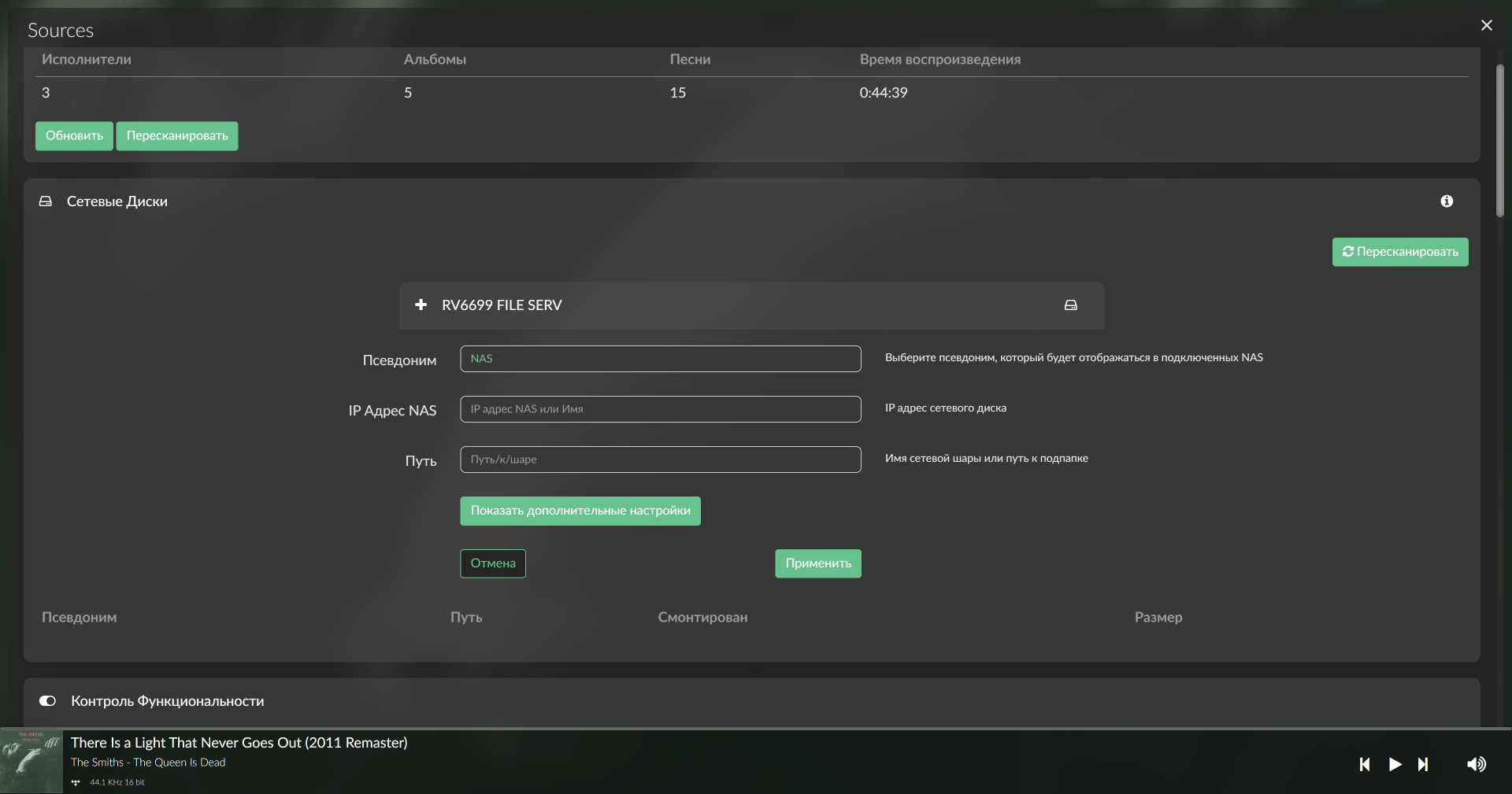 Далее стоит добавить источники — переходим в раздел Sources, который почему-то не переведен. Плеер легко «увидел» как подключенный к USB-порту внешний диск, так и присутствующий в сети NAS. Их содержимое можно сразу просканировать и добавить в библиотеку.