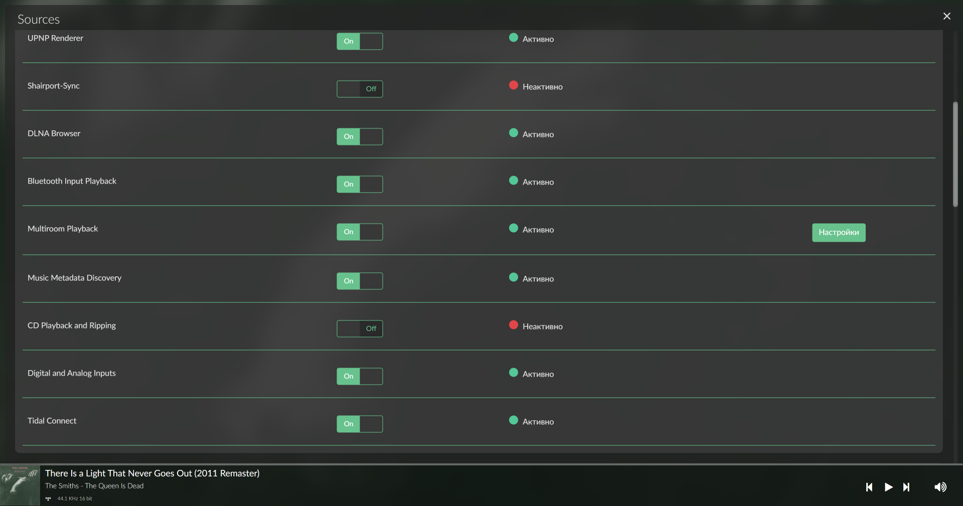 Источники можно включать, отключать, настраивать — опций множество. В той же вкладке находятся настройки мультирума.