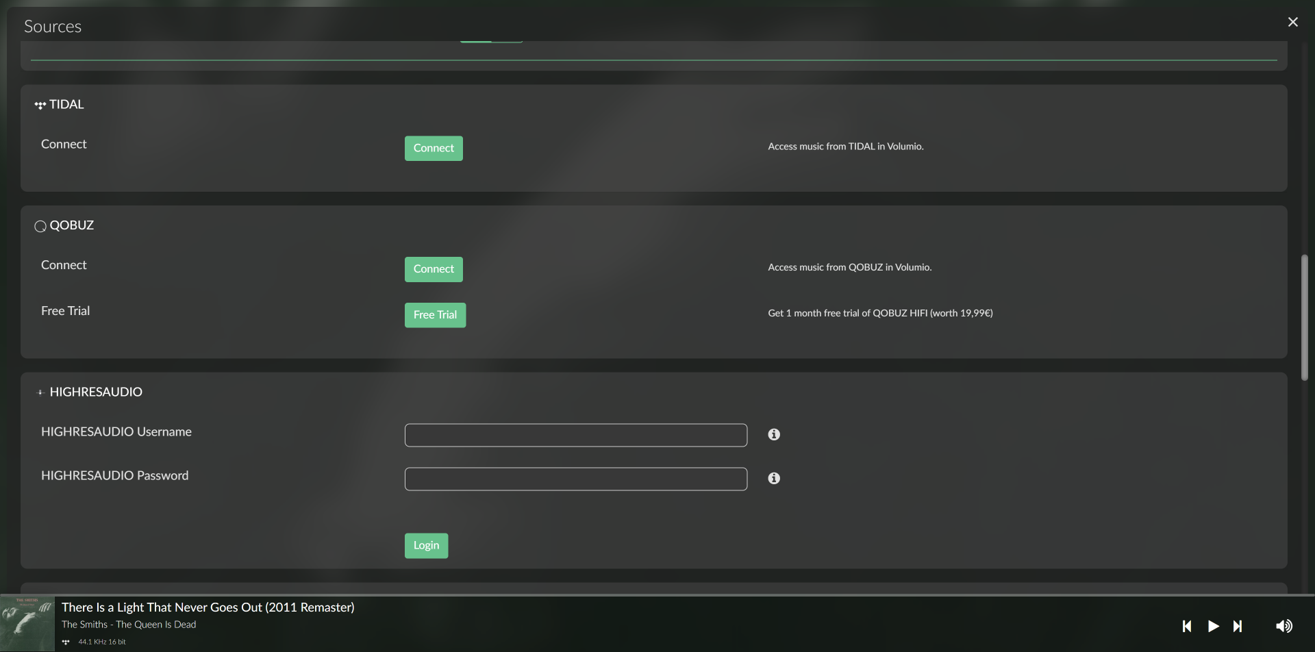 Нас же очень интересует еще один источник — стриминговый сервис Tidal, хорошо знакомый всем любителям качественного музыкального контента. Находим соответствующий пункт меню…