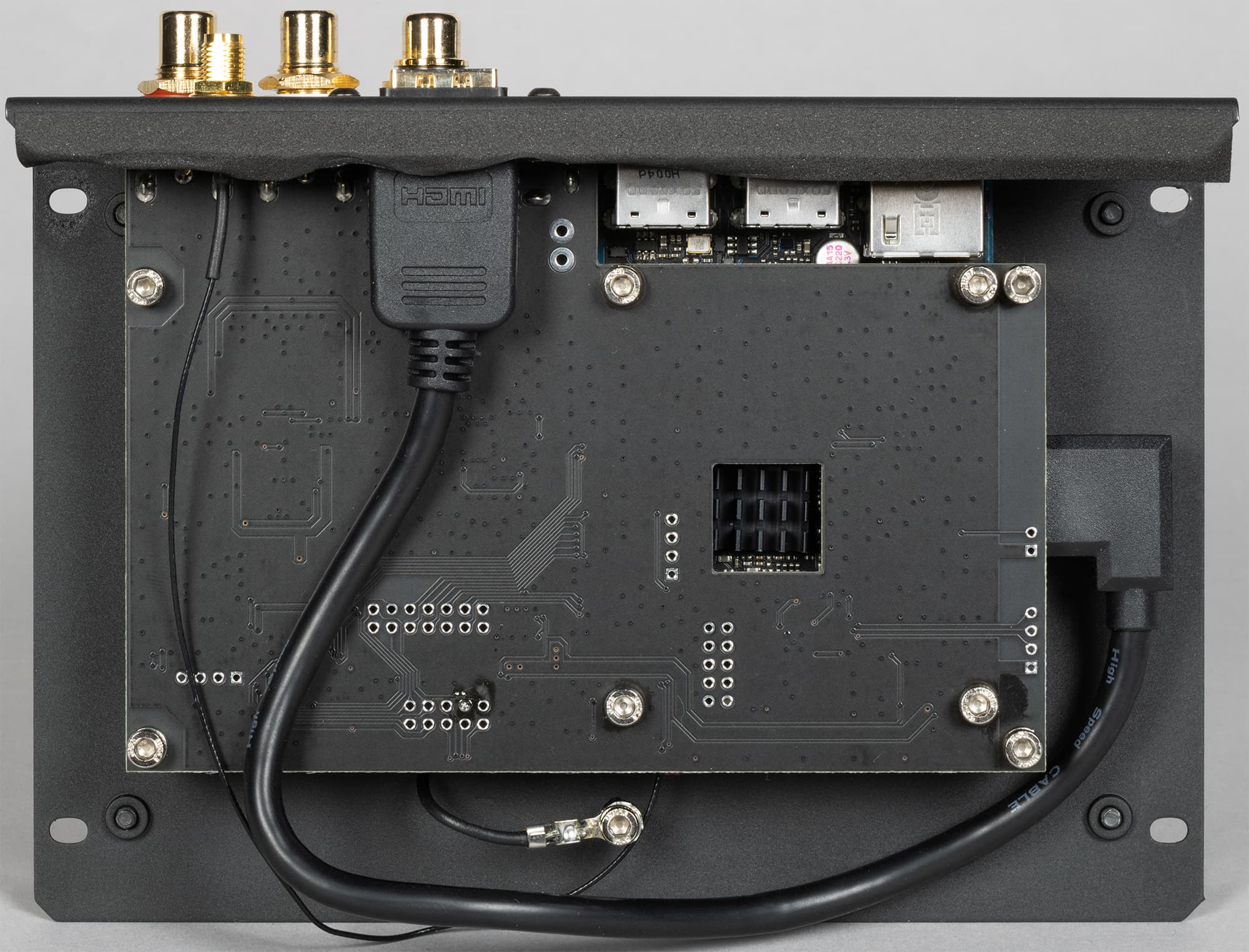 Выкручиваем упомянутые выше винты — снимаем крышку и разбираем корпус, тут все просто и легко. Первым делом видим внушительных габаритов кабель, соединяющий разъемы HDMI на плате микрокомпьютера и задней панели.
