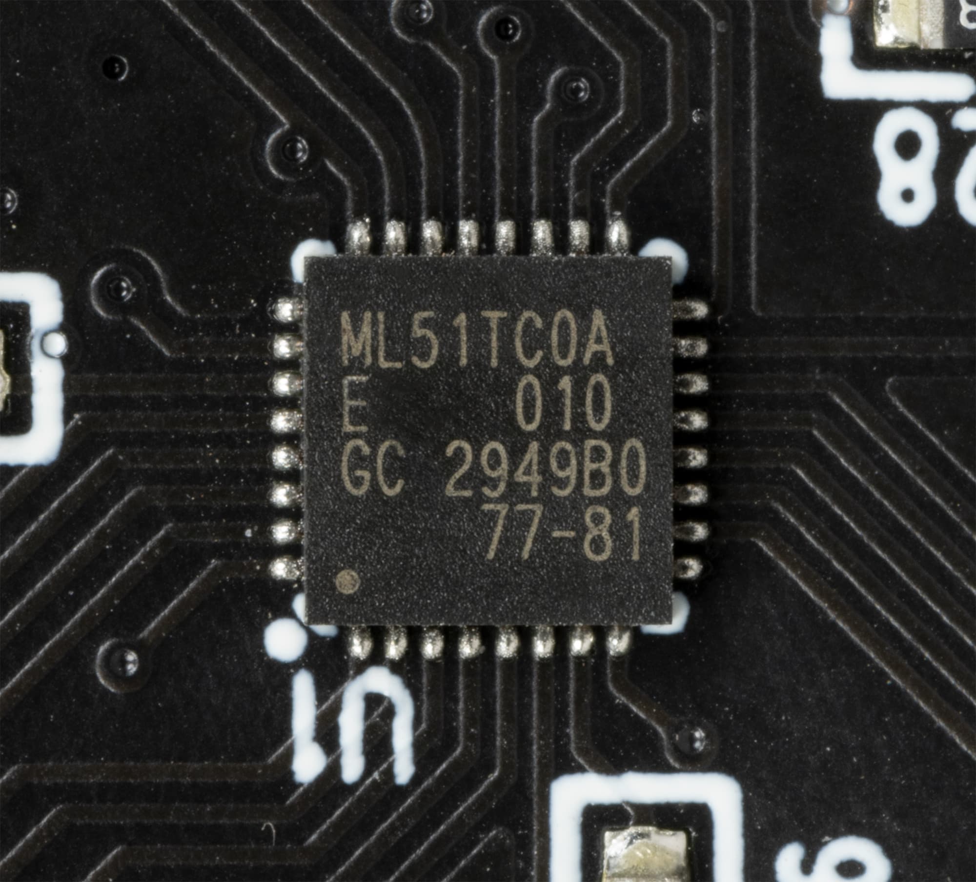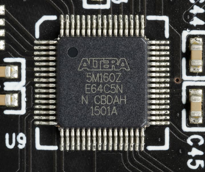 Слева вверху видна CPLD (программируемая логическая интегральная схема) Altera 5M12OZ E64C5N. В правом углу снизу — микроконтроллер ML51TC0AE.