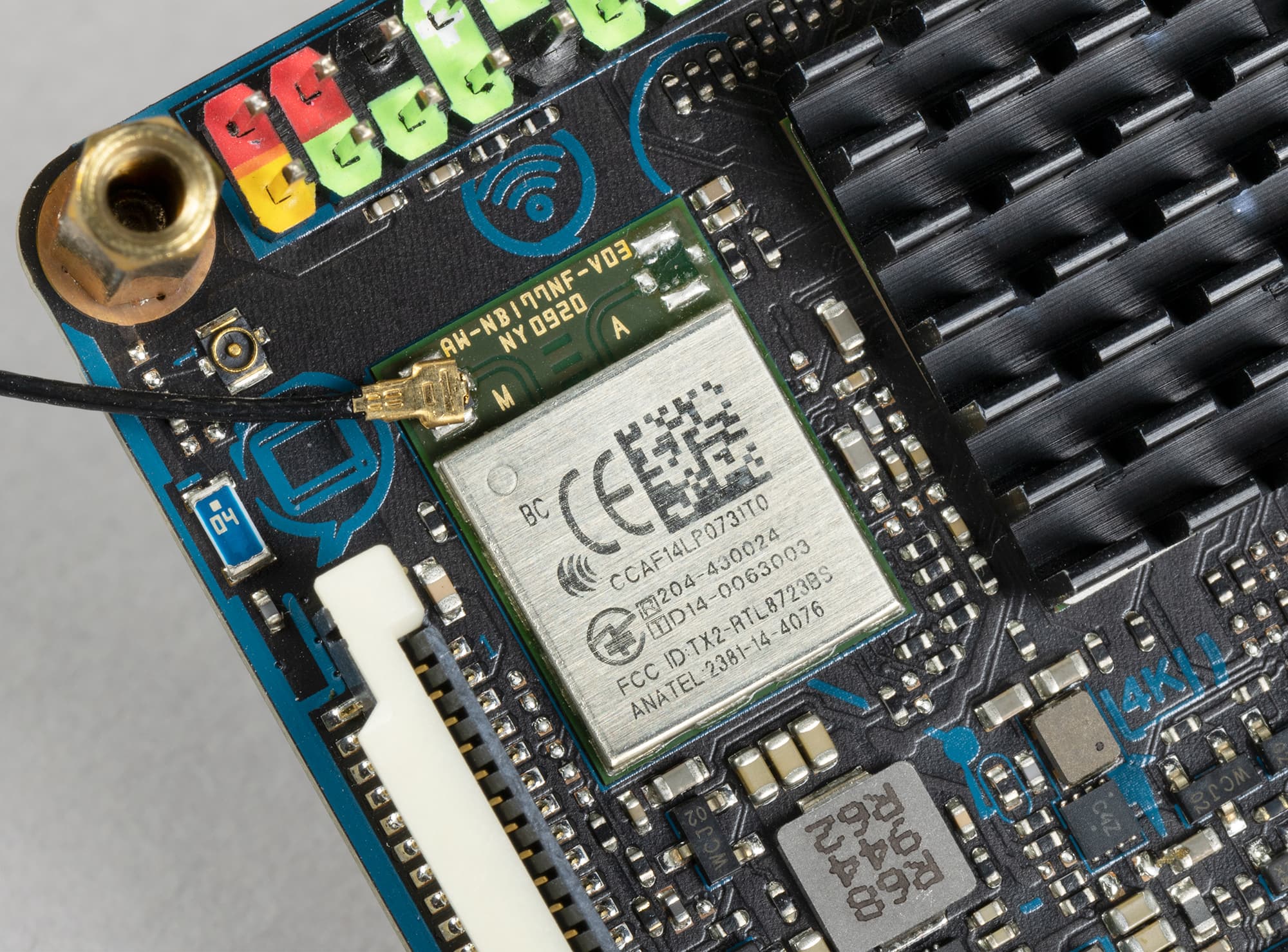 За поддержку Wi-Fi отвечает модуль CCAF14LP0731T0, о наличии которого также извещает надпись на другой стороне платы. От него к задней стенке корпуса тянется кабель, заканчивающийся разъемом для присоединения внешней антенны.