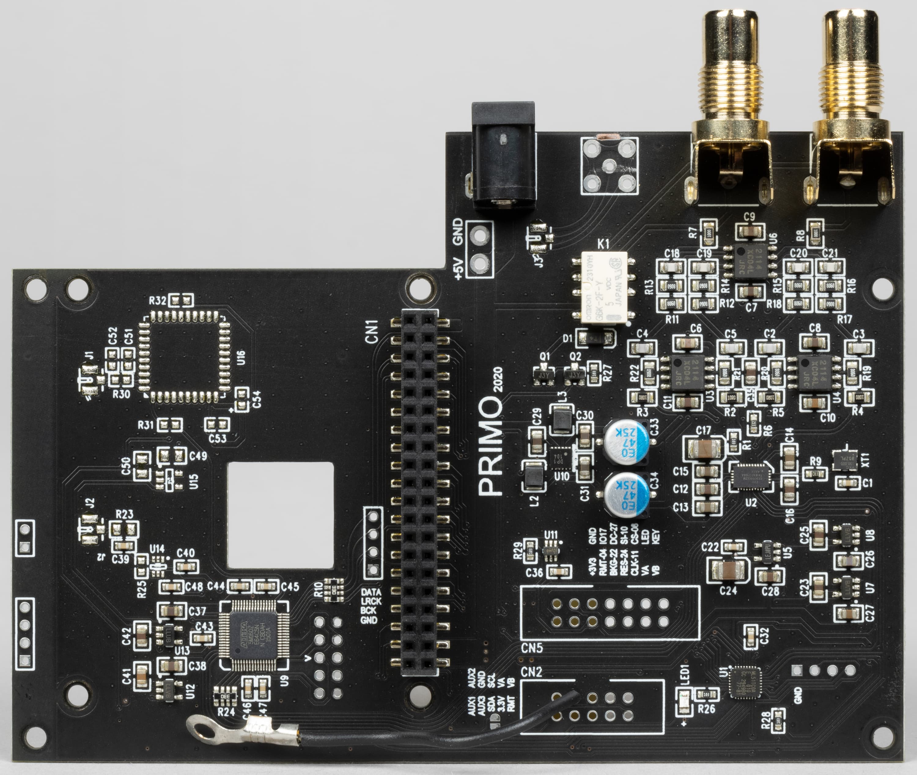 Демонтируем верхнюю плату. В верхней ее части мы видим разъемы RCA. На всякий случай напомним, что иллюстрация увеличивается по клику — все маркировки можно рассмотреть. Ну а мы остановимся на самых интересных элементах.
