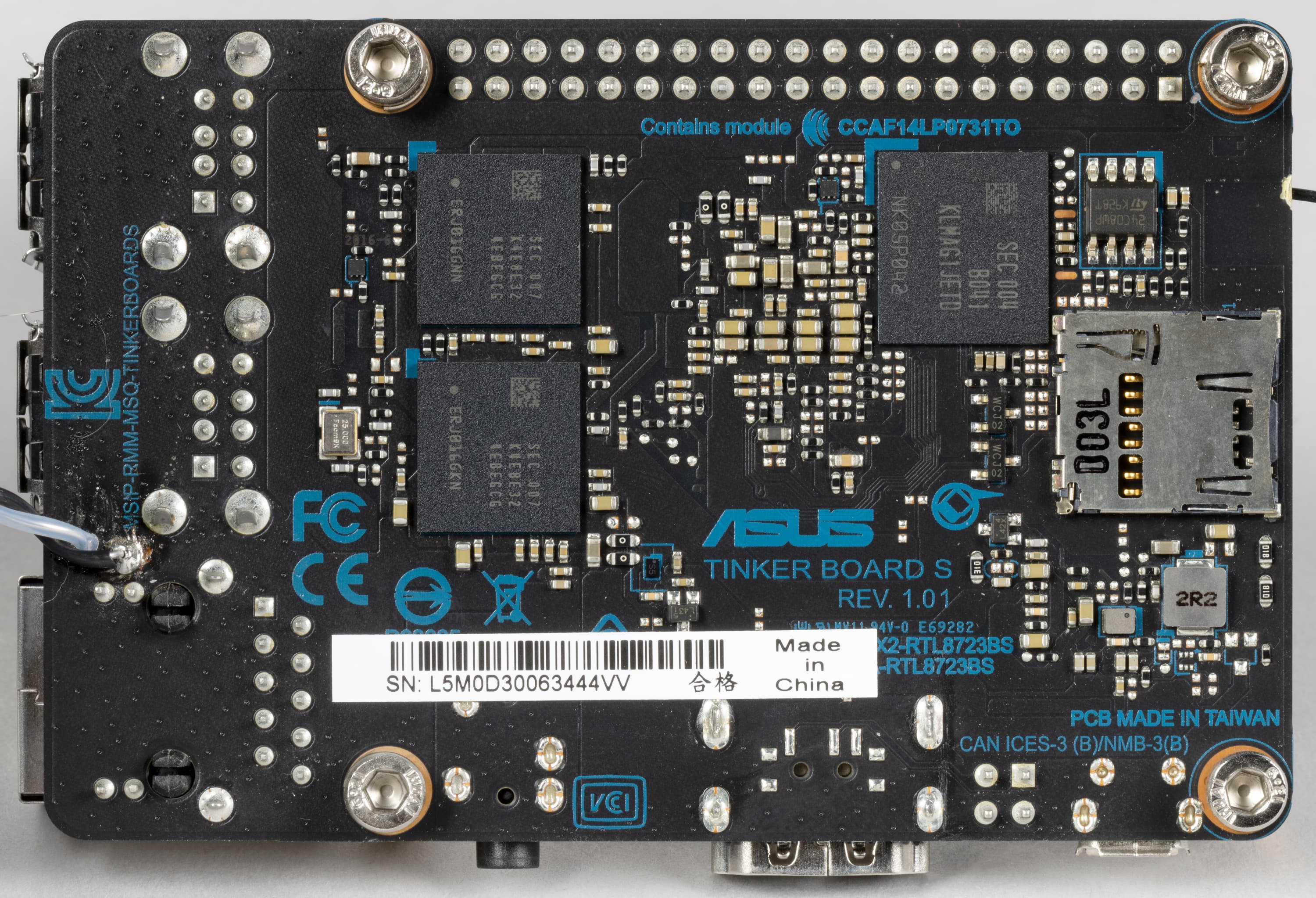 Ну а нижняя плата — это уже упомянутый выше Asus Tinker Board S, на что нам еще раз намекает надпись. На нижней стороне видна пара микросхем оперативной памяти и слот для карт памяти формата microSD.