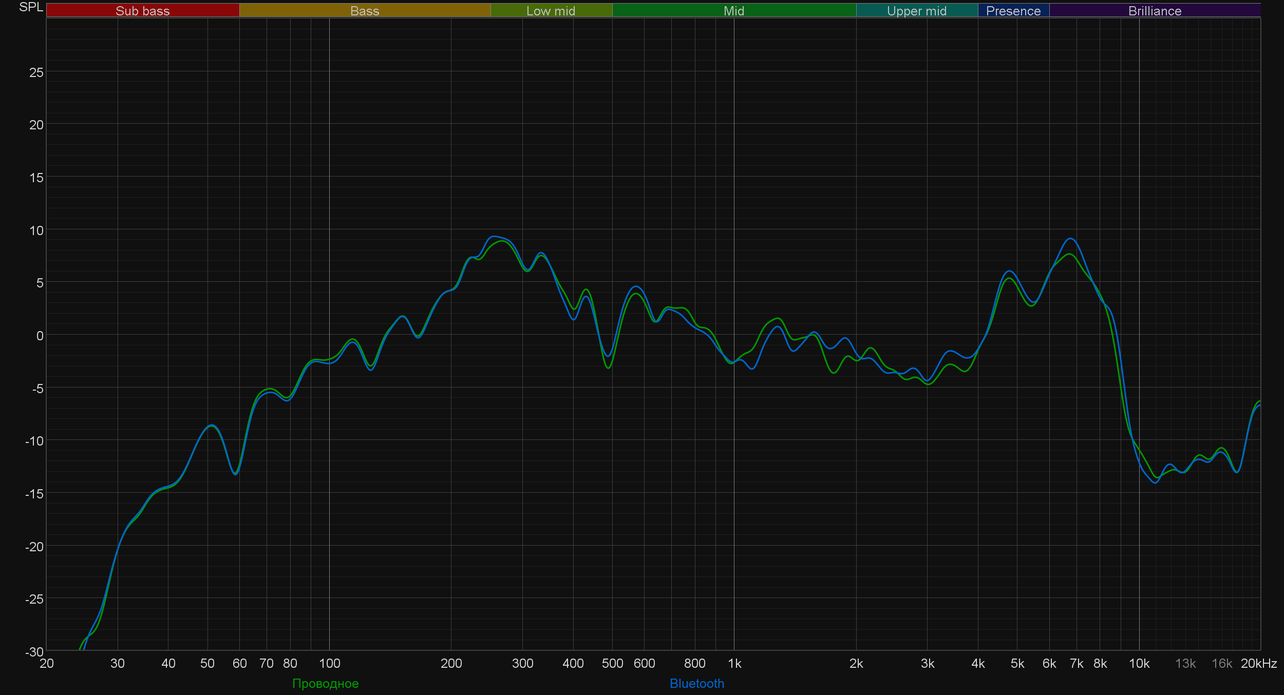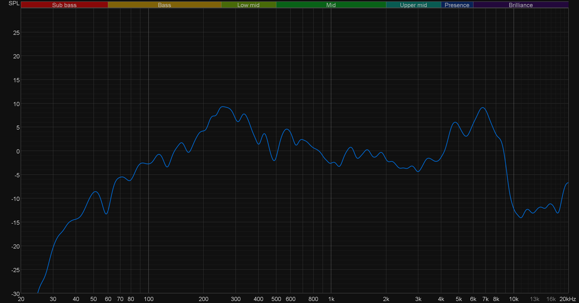 Что же касается звука… В общем, все плохо. Не будем рассуждать про детальность, особенности подачи музыкального материала и так далее. В данном случае это неуместно. Просто покажем график АЧХ, полученный традиционным для наших обзоров образом — при размещении измерительного микрофона в 60 см от колонки на оси ВЧ-динамика. Производитель явно рассчитывает на то, что слушатель в основном будет пользоваться Bluetooth-подключением, с него и начнем.