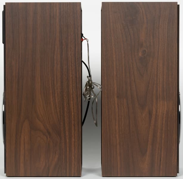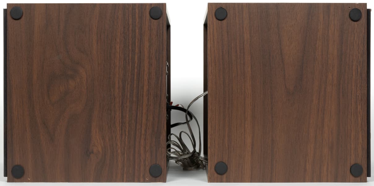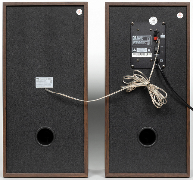 На задней панели активной колонки находятся клеммы для подключения пассивной, выключатель и несъемный кабель питания. У пассивной мы видим лишь отверстие, из которого выходит кабель для подключения к активной. Плюс небольшую наклейку с краткими характеристиками.