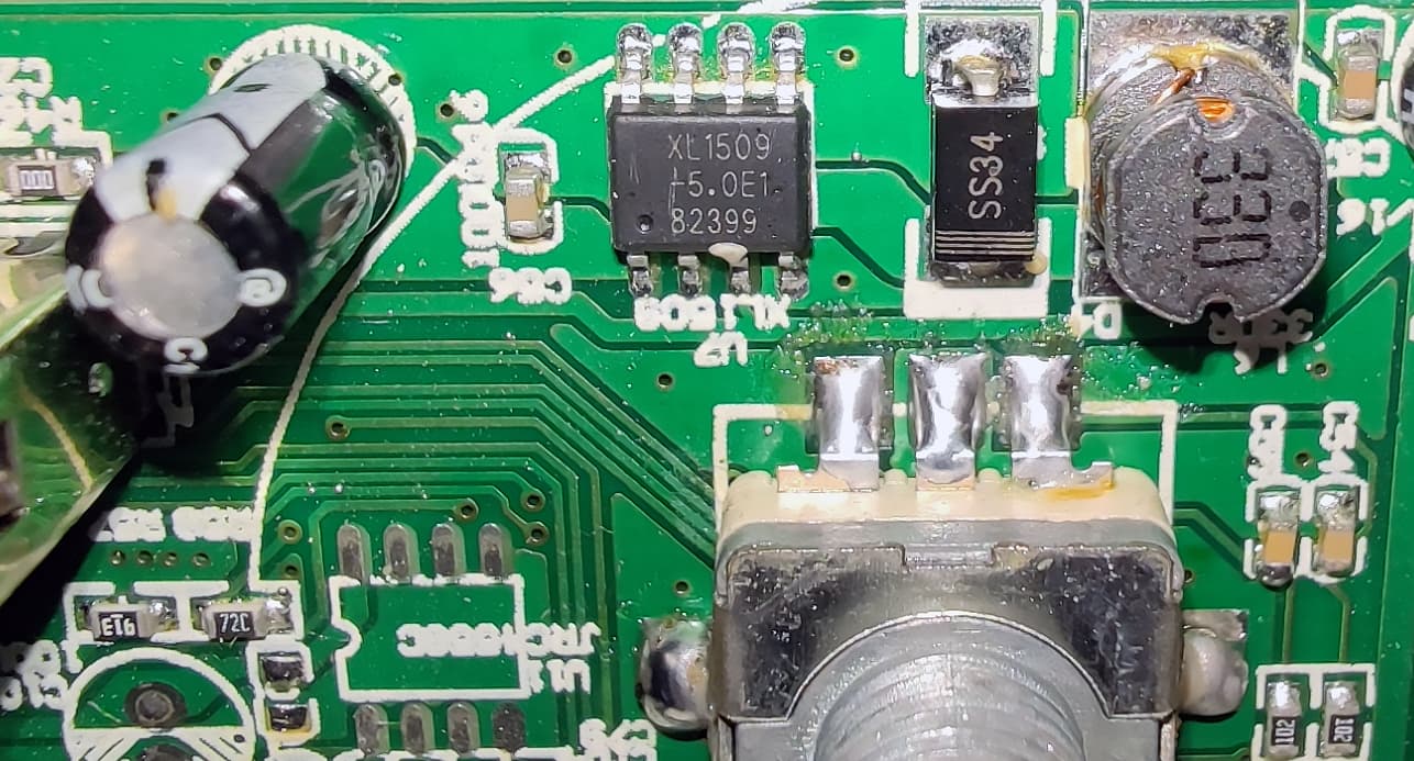 В нижней части виден преобразователь DC-DC XL1509. Заодно еще раз посмотрим на качество пайки… И вот так по всей плате.