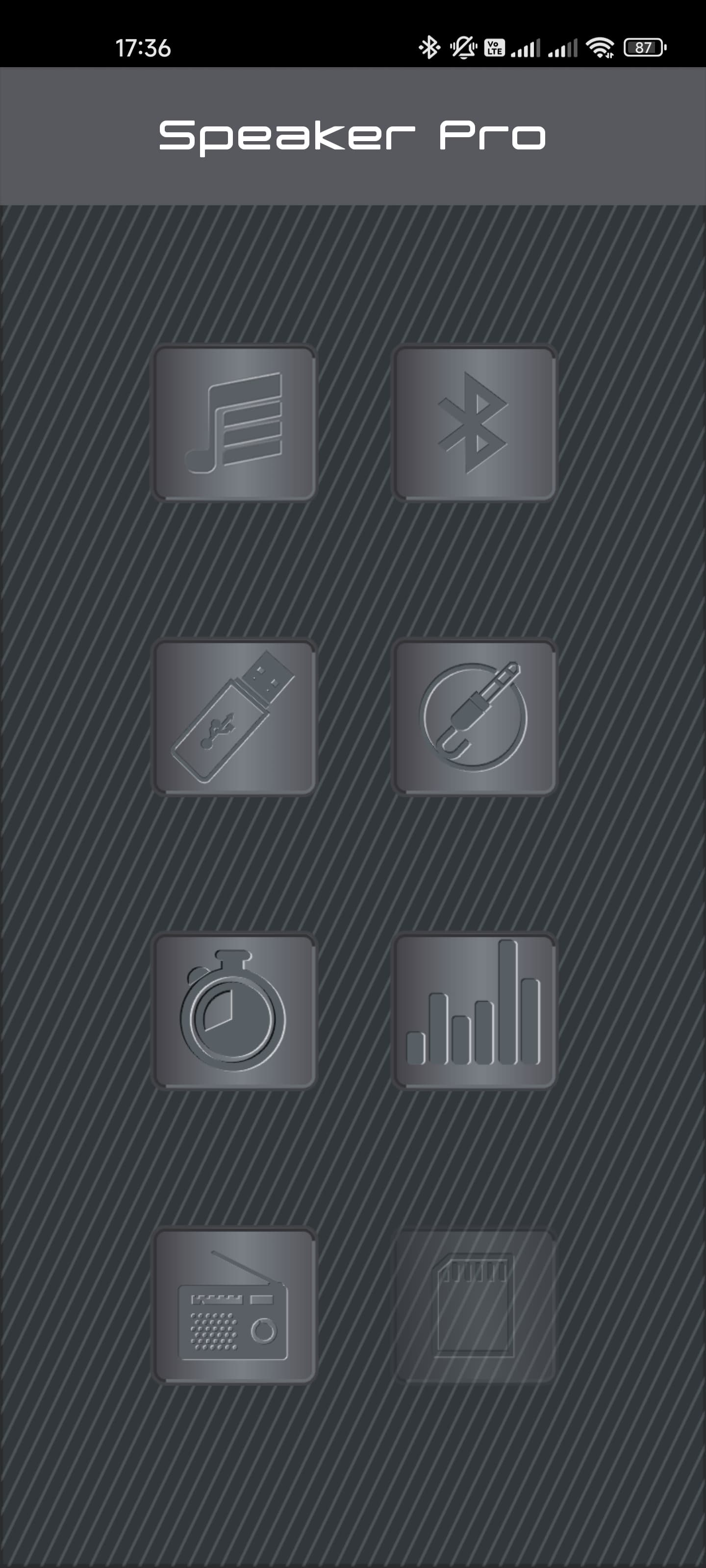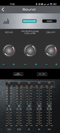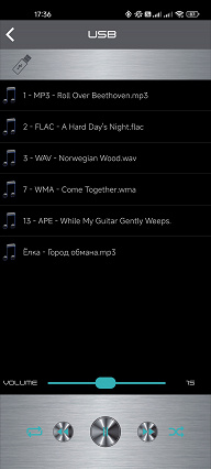 И, наконец, приложение Speaker Pro, найти которое можно в Google Play или App Store. Внешний его вид вызывает ощущение «сделанности на коленке», но работает ПО вполне корректно. На главной странице нас ожидает ряд иконок, ведущих на вкладки управления различными функциями. Первая позволяет транслировать треки с подключенного гаджета посредством Bluetooth. Далее мы видим страницу подключения различных устройств, ну и панель управления USB-плеером. На последней есть даже имена файлов, что более-менее компенсирует отсутствие подробных данных о воспроизводимом треке на передней панели.