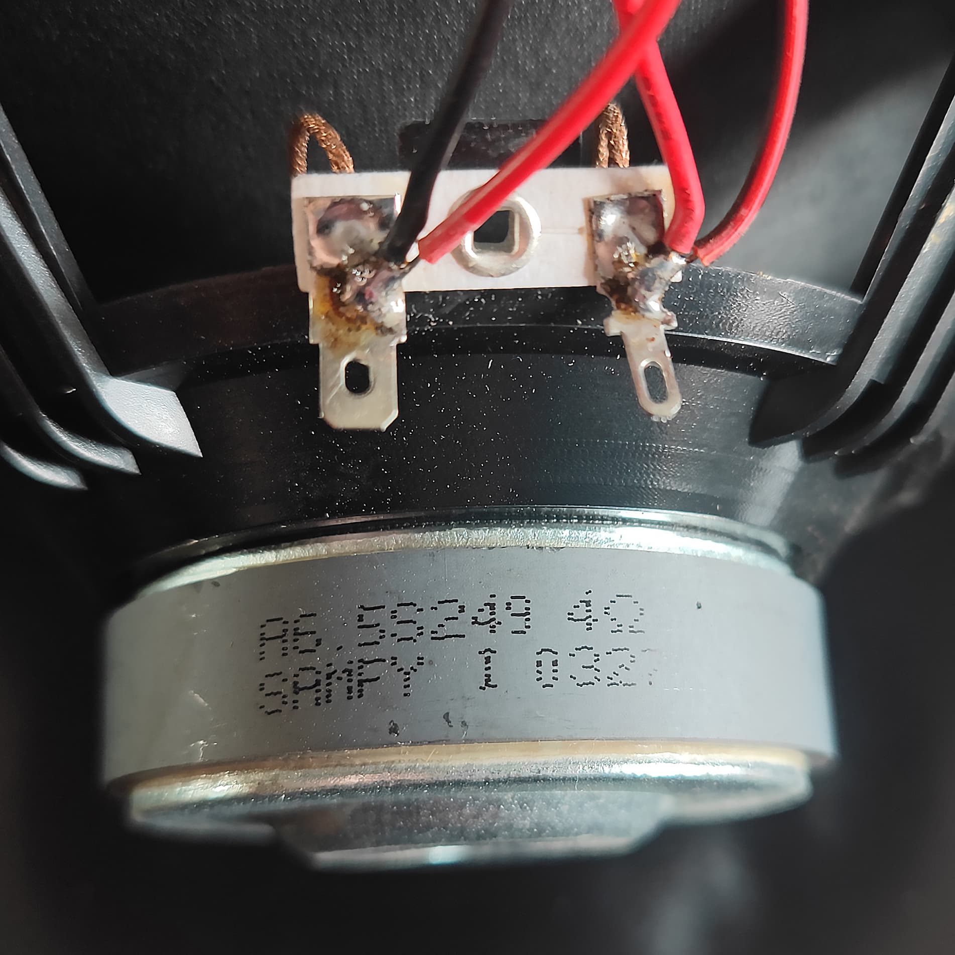 Посмотрим на маркировку НЧ-динамика: все те же 4 Ом. Качество пайки как-то даже комментировать не хочется.