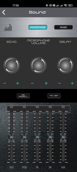 Регулятор громкости — валкодер с дискретным ходом без ограничения угла вращения. Нажатие на него приводит к входу в меню, из которого можно сделать много всего интересного — в частности, настроить эквалайзер и наложить эффекты на подключенные микрофоны. Для большей наглядности позаимствуем иллюстрацию из инструкции.