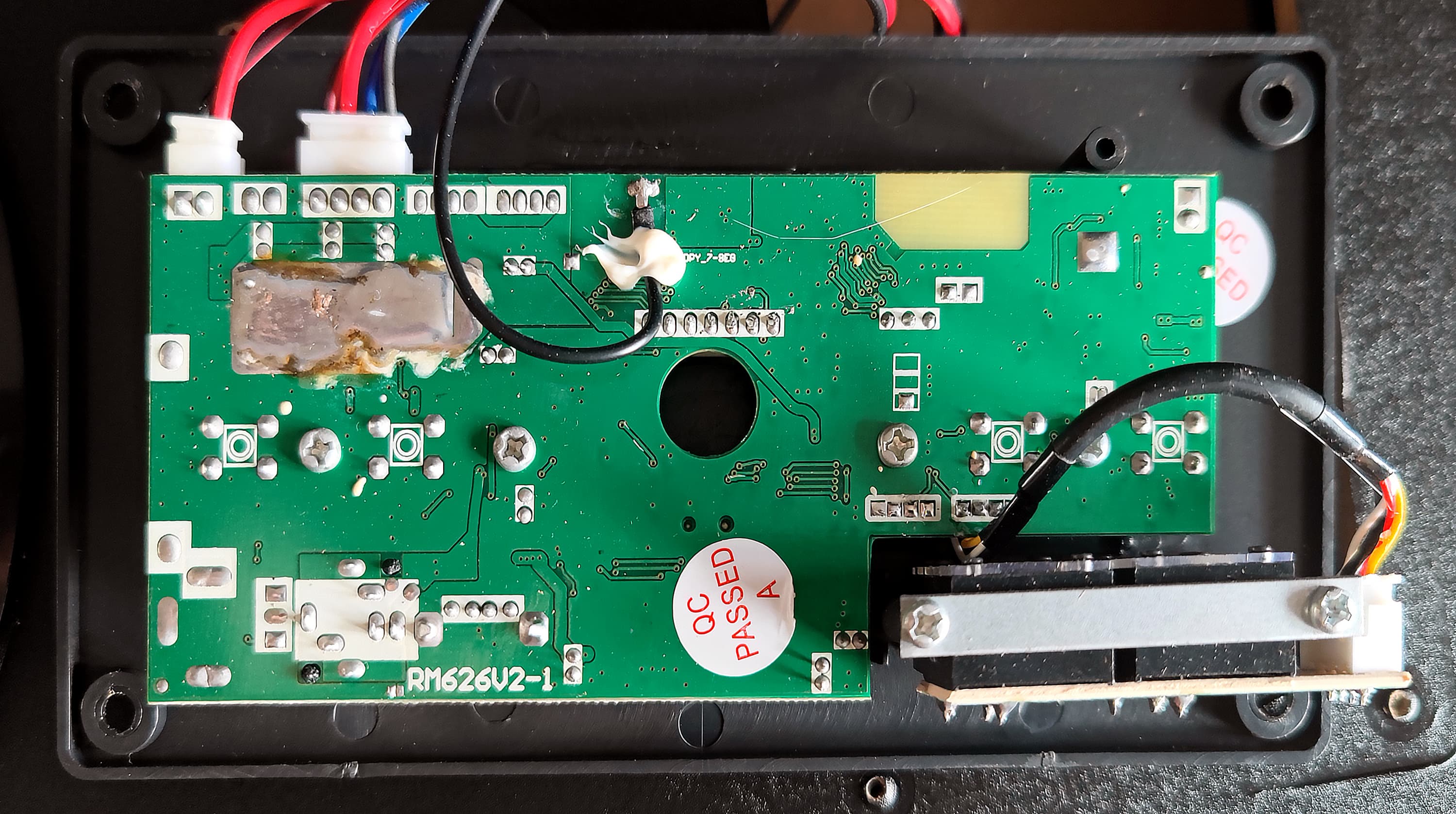 Настало время панели управления. Снимаем ее, смотрим на заднюю поверхность. Лужа припоя с неотмытым флюсом в левом верхнем углу, вероятно, призвана заменить радиатор.
