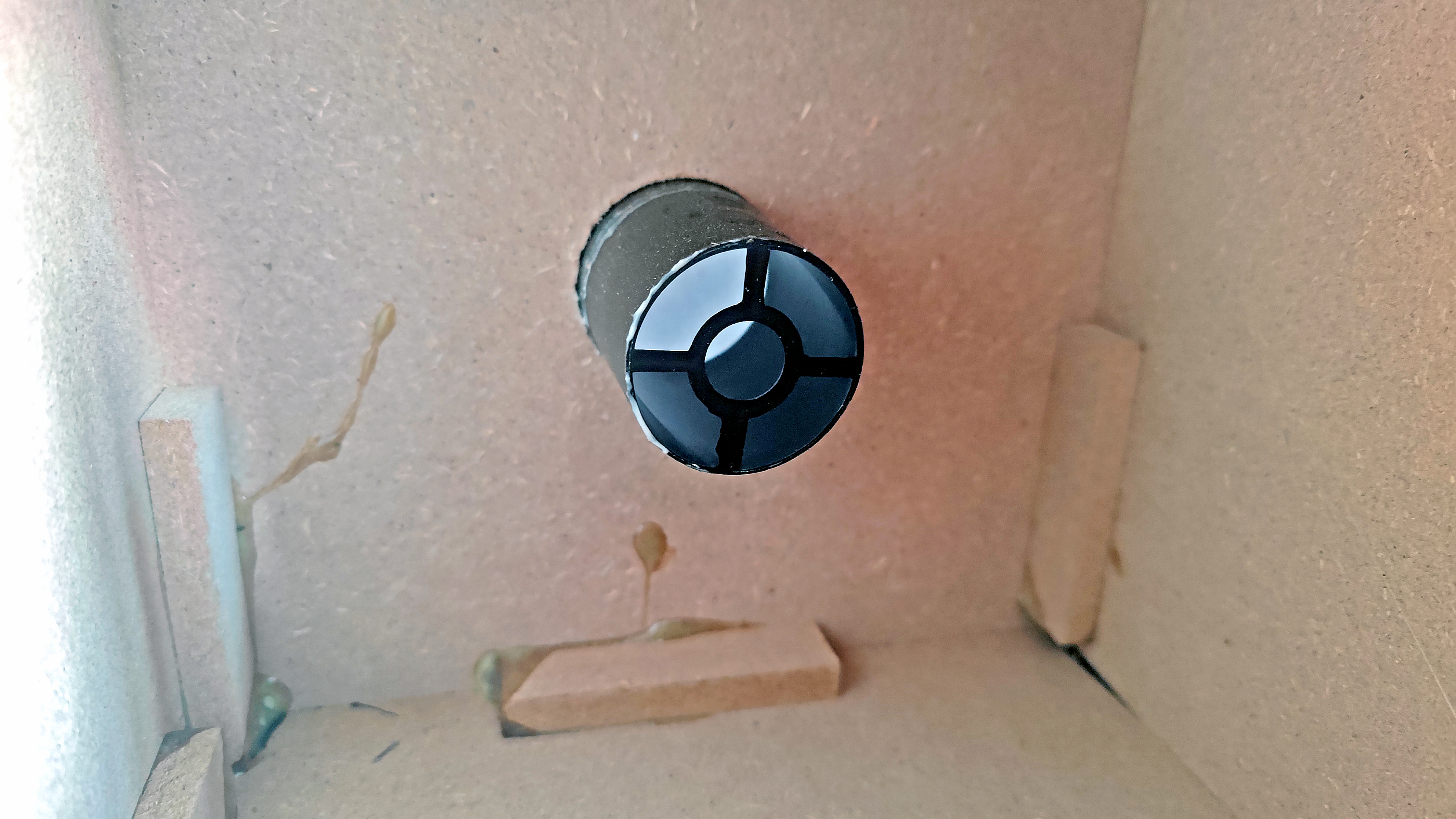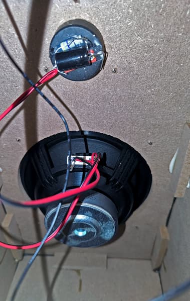 Сразу понимаем, что собраны колонки из веточек (они же палочки) и известной связующей субстанции. Основой служат панели из прессованной древесной пыли толщиной 10 мм, буквально рассыпающиеся в руках. Внутри нас ждут торчащие концы шурупов и удерживающие конструкцию брусочки из того же материала, обильно залитые клеем. На ВЧ-динамике мы видим парочку элементов, качество монтажа которых даже обсуждать не будем. Вероятно, они выполняют роль пассивного кроссовера. Ну и хотя бы вот самого крохотного кусочка демпфирующего материала внутрь корпуса производитель положить не удосужился.