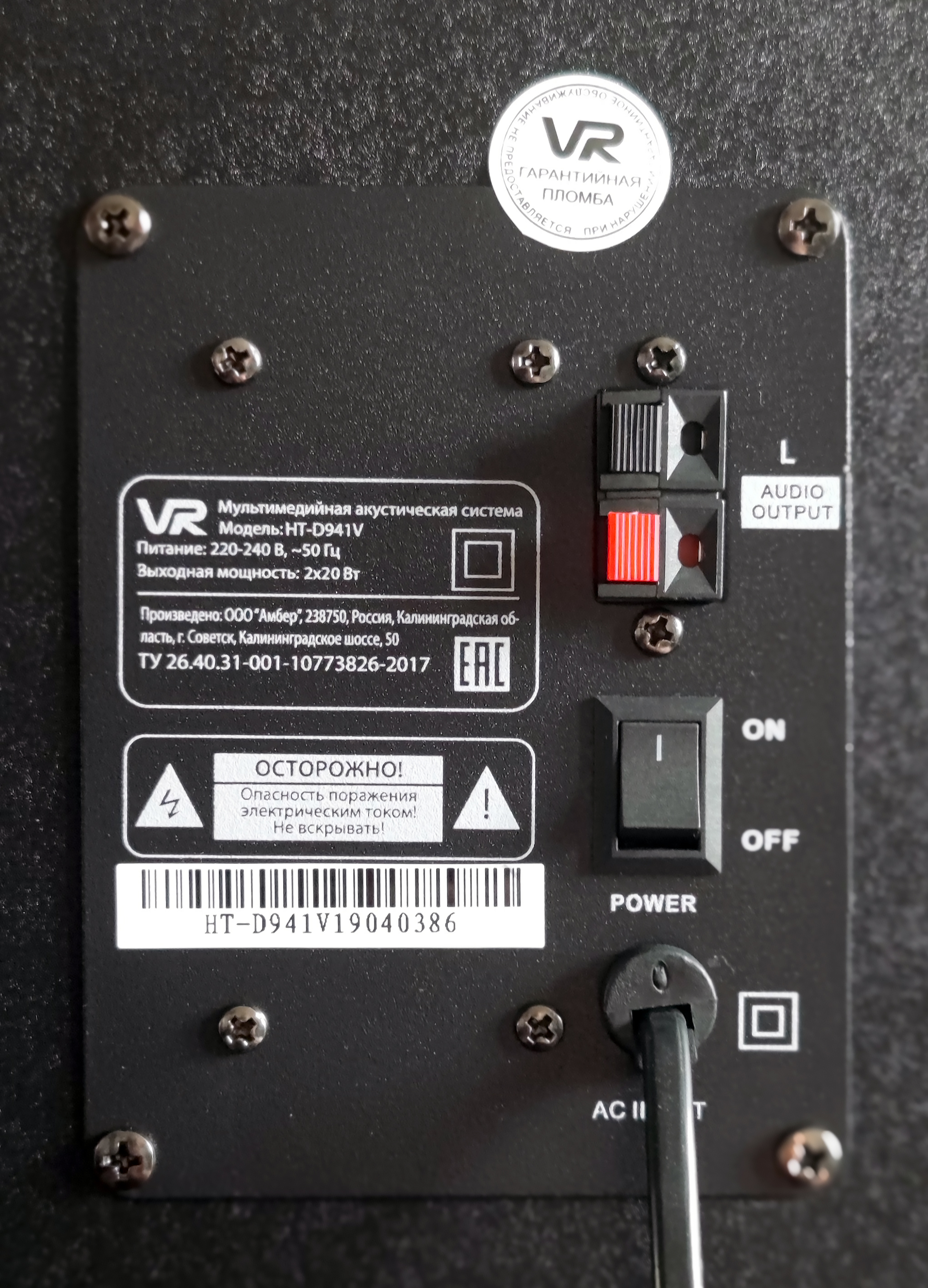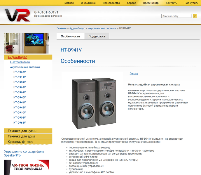 Что особенно интересно, в России функционирует завод VR Electronics, расположенный в г. Советск Калининградской области. Где как раз и была произведена двухполосная акустика HT-D941V, которая вызывает просто массу любопытства: производитель делает особый акцент на высоком качестве звучания и том, что ее усилитель выполнен на дискретных элементах (транзисторах). Кроме того, колонки оснащены несколькими входами для источников звука, регуляторами тембра, входами для подключения микрофонов, ПДУ и прочими «фишками».