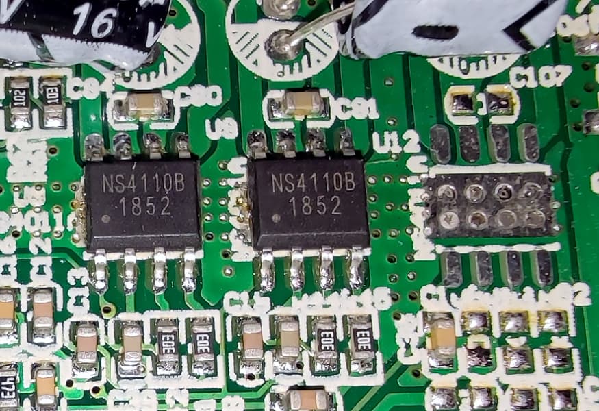 А вот, собственно, и усилители — две микросхемы NS4110B. И еще одно подготовленное посадочное место, у которого не получилось. Лужа припоя на обратной стороне, кстати, призвана «охлаждать» как раз эту локацию. Если мы правильно поняли замысел разработчиков, конечно. А вот почему так странно получилось с усилителями — не очень ясно. Варианта тут два. Первый — производитель специально обманывает потенциальных покупателей. Второй — автор описания принял за «дискретные элементы усилителя» размещенные на радиаторах транзистор и диод в блоке питания. И вот тут даже непонятно, что хуже.
