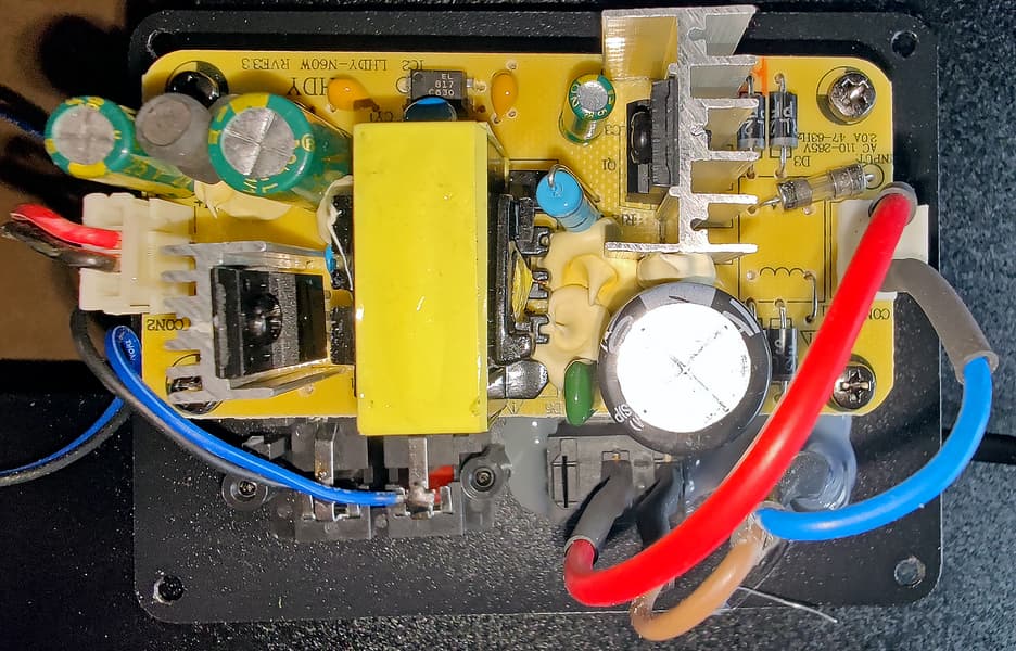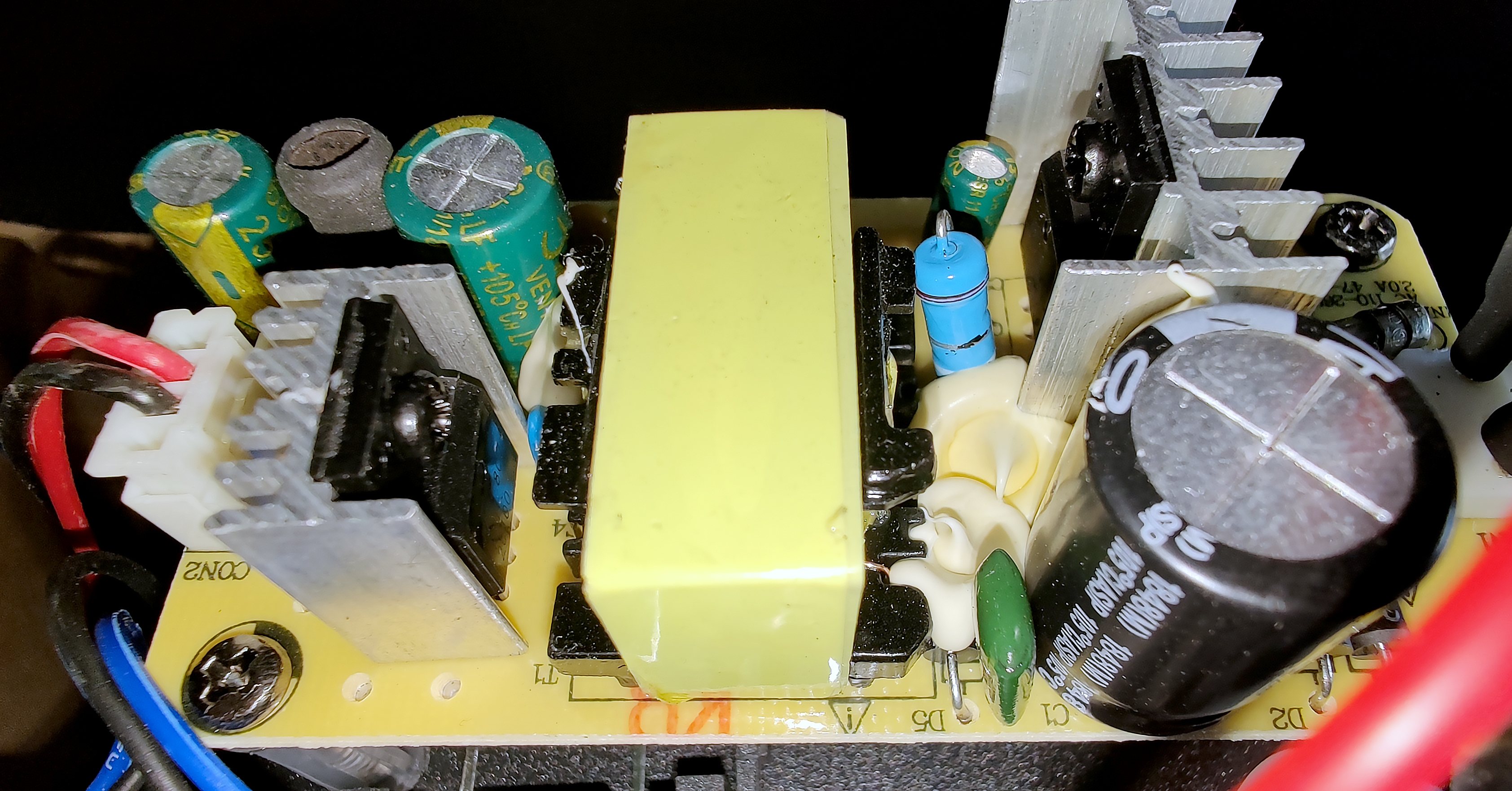 Тут надо обратить внимание на два элемента, размещенных на радиаторах: транзистор FHF5N60 и диод Шоттки FHF20100 — к ним мы еще вернемся чуть ниже.