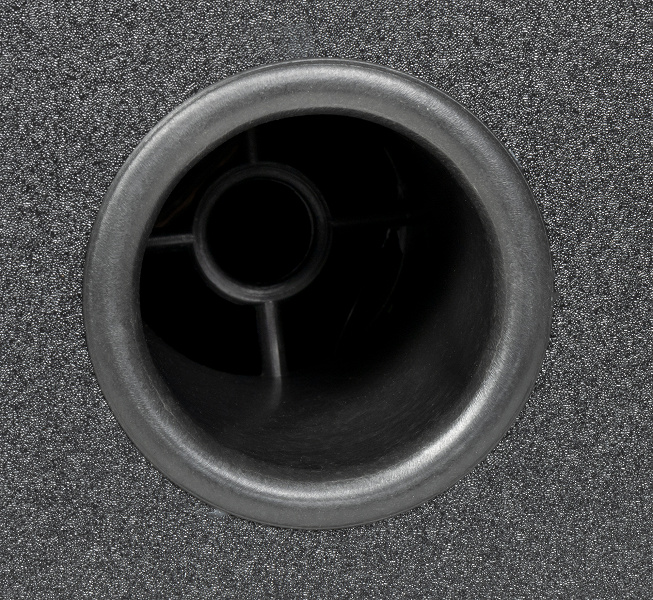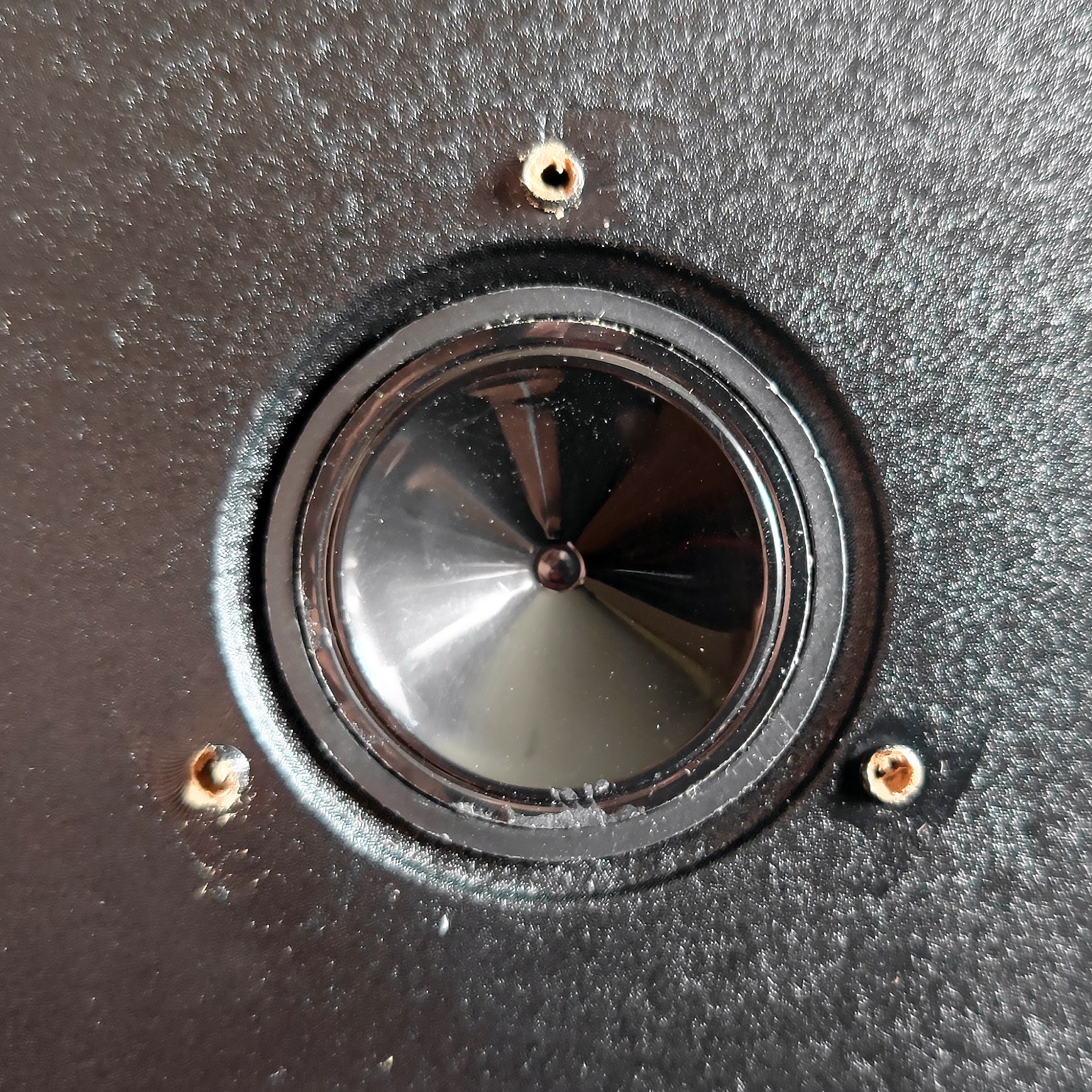 Сняв решетку ВЧ-динамика, обнаруживаем под ней пластиковую мембрану. Твитер размещен в собственном корпусе и намертво вклеен в переднюю стенку — демонтировать его не удалось.