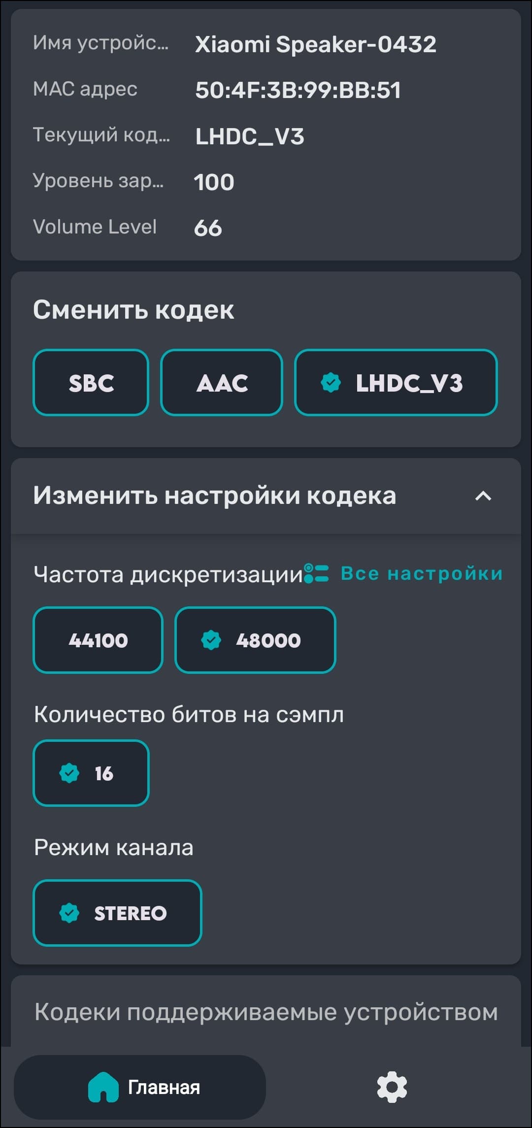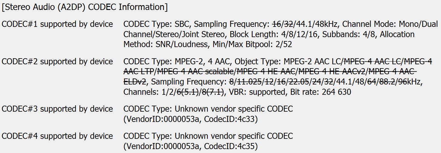 Во всех случаях автоматически активировался кодек AAC, при этом не во всех оболочках есть возможность переключиться на LHDC через системное меню, один раз пришлось делать это через меню разработчика. Возможности делать это через фирменное ПО очень не хватает, конечно. Ну а полный список поддерживаемых кодеков и их режимов мы традиционно получили с помощью утилиты Bluetooth Tweaker.