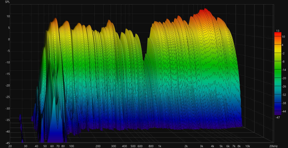 Бас склонен к «гудению», что отлично видно на графике кумулятивного затухания спектра (он же «водопад» или waterfall). Для портативной колонки с двумя пассивными излучателями это вполне ожидаемо и укладывается в норму. С учетом небольших размеров корпуса само наличие ощутимого баса уже можно считать плюсом акустики.