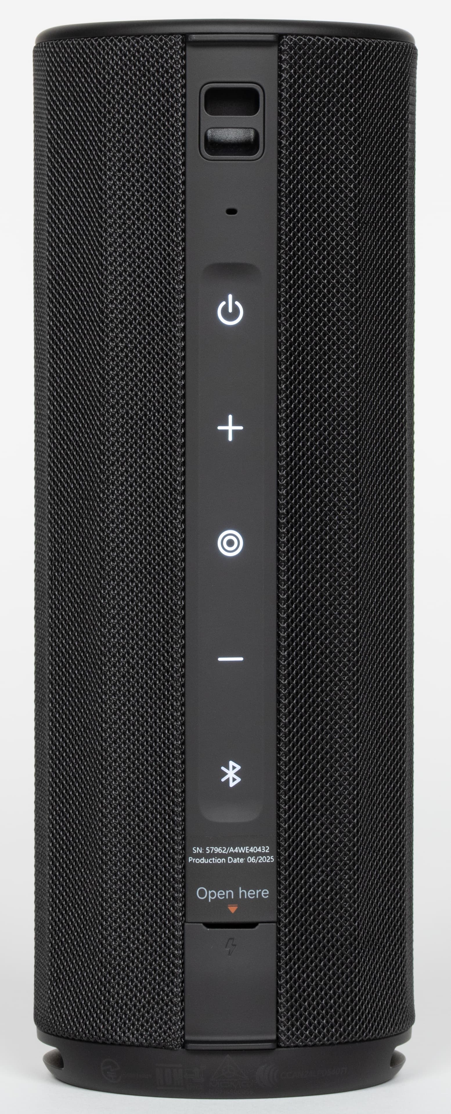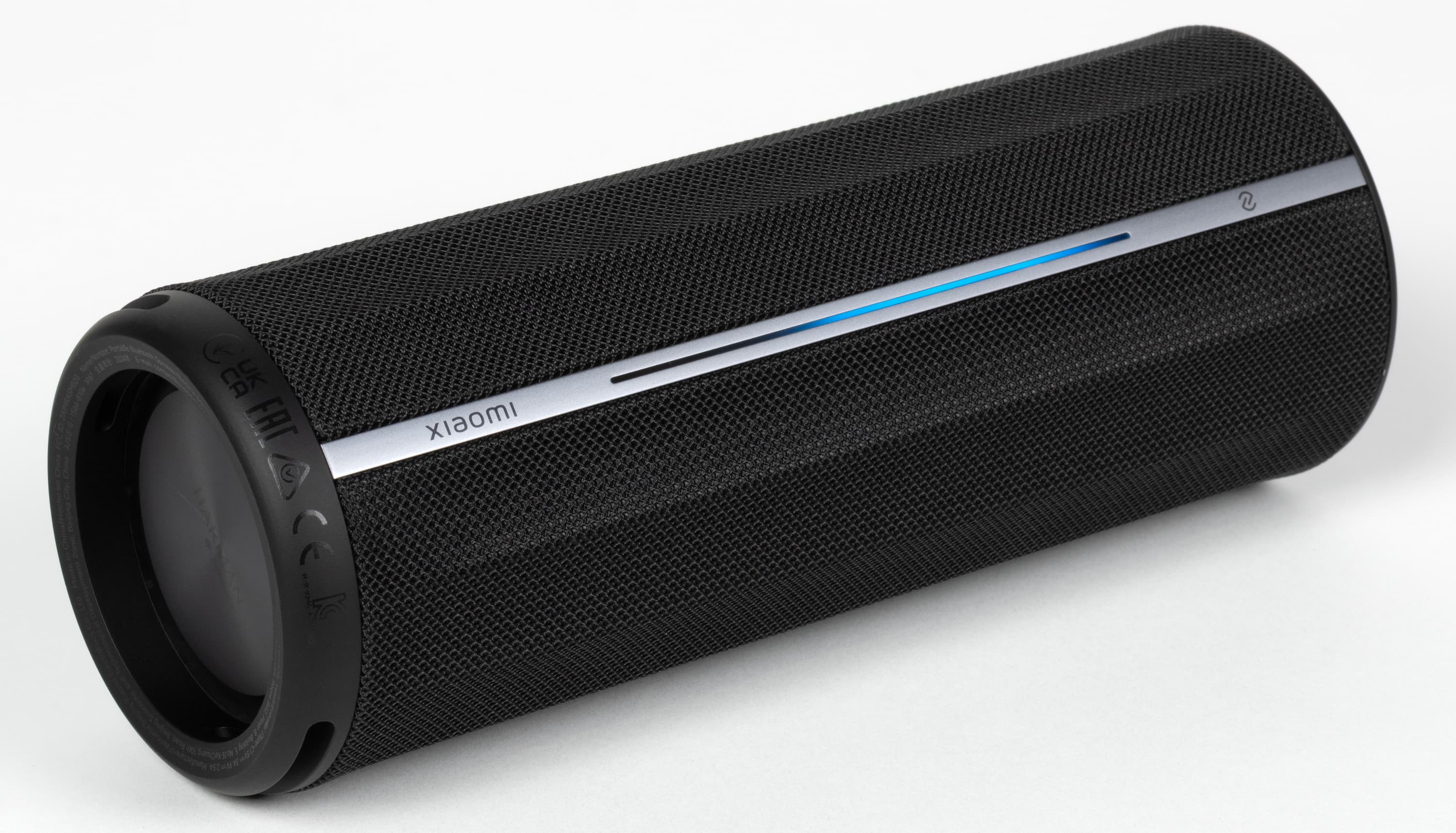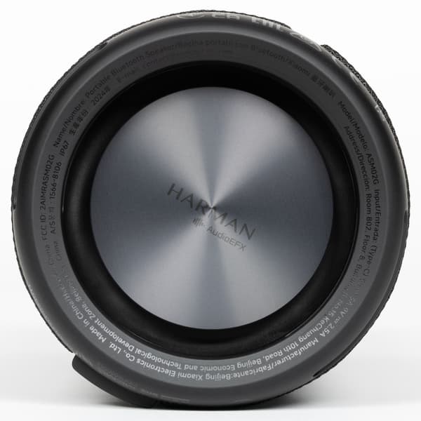 На торцах цилиндрического корпуса находятся пассивные излучатели, на которых нанесен логотип Harman AudioEFX. Под этим названием Harman объединяет комплекс решений по акустической настройке: оптимизацию формы корпуса, алгоритмы цифровой обработки и регулировку работы излучателей. На нижнем защитном элементе по периметру есть служебная маркировка. Выполнена она черным по черному и заметна только под углом, поэтому особо не бросается в глаза.