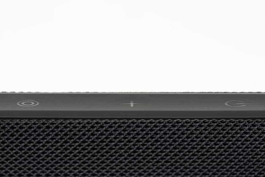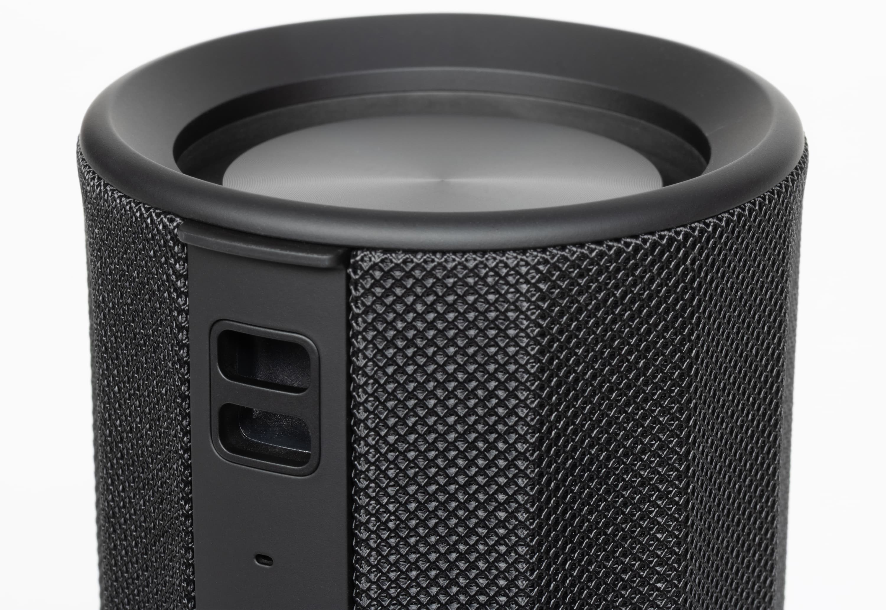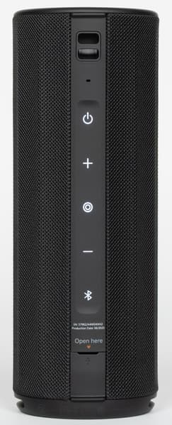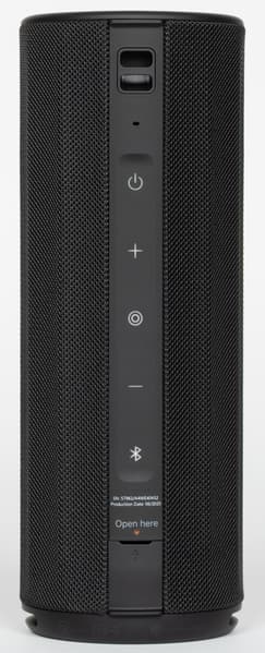 Боковые стороны колонки обтянуты тканевой сеткой с довольно крупным плетением. Поверхность обработана водоотталкивающим составом: попавшая на нее вода почти не впитывается и скатывается каплями. Материал неплохо противостоит загрязнениям и при необходимости легко очищается. На торцах корпуса расположены резиновые вставки, обрамляющие пассивные излучатели. Нижняя из них дополнительно приподнимает колонку при вертикальной установке, что помогает басу свободнее распространяться.
