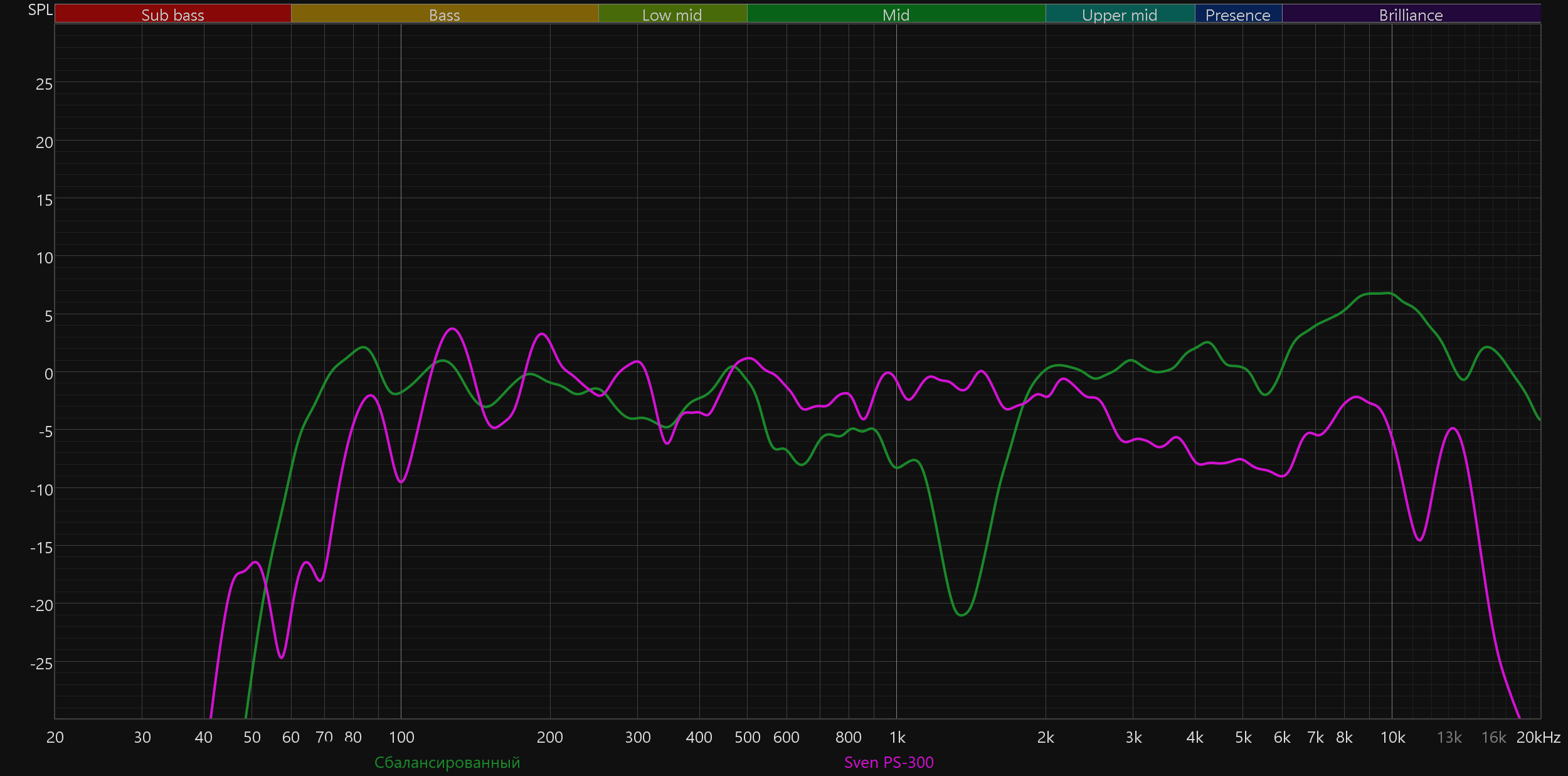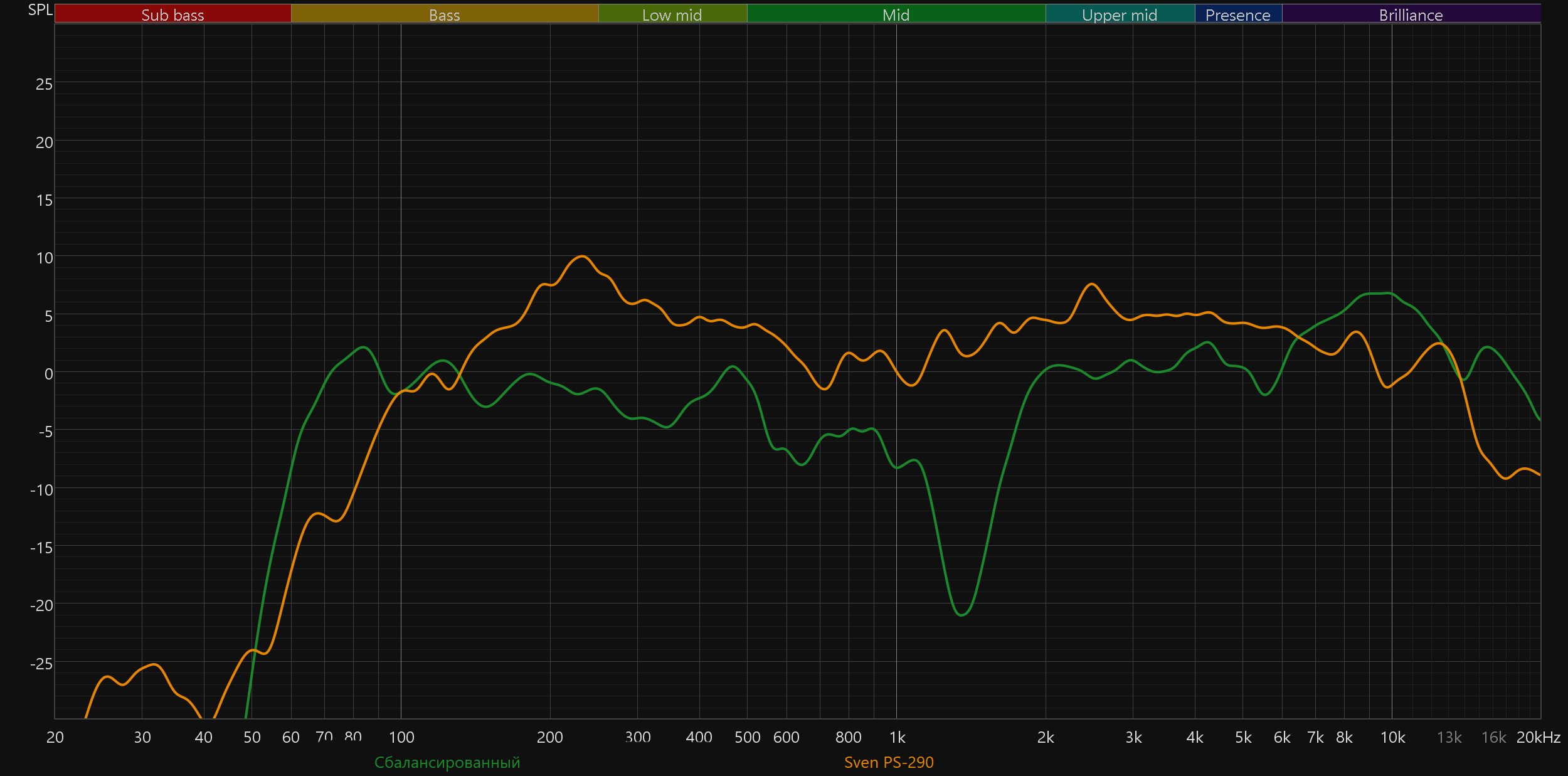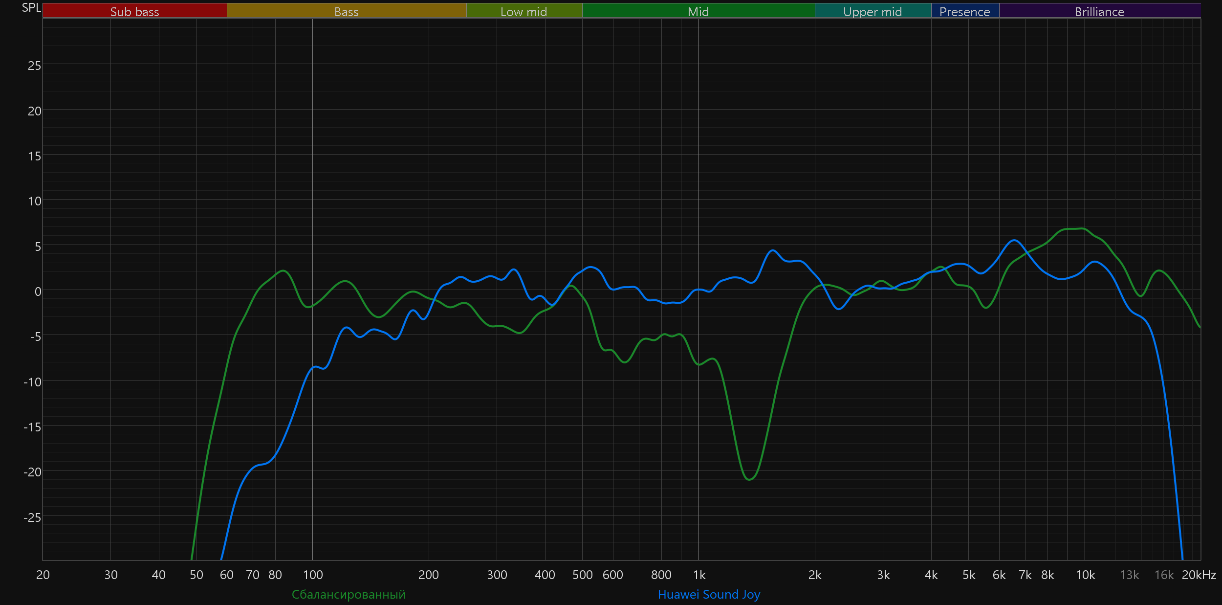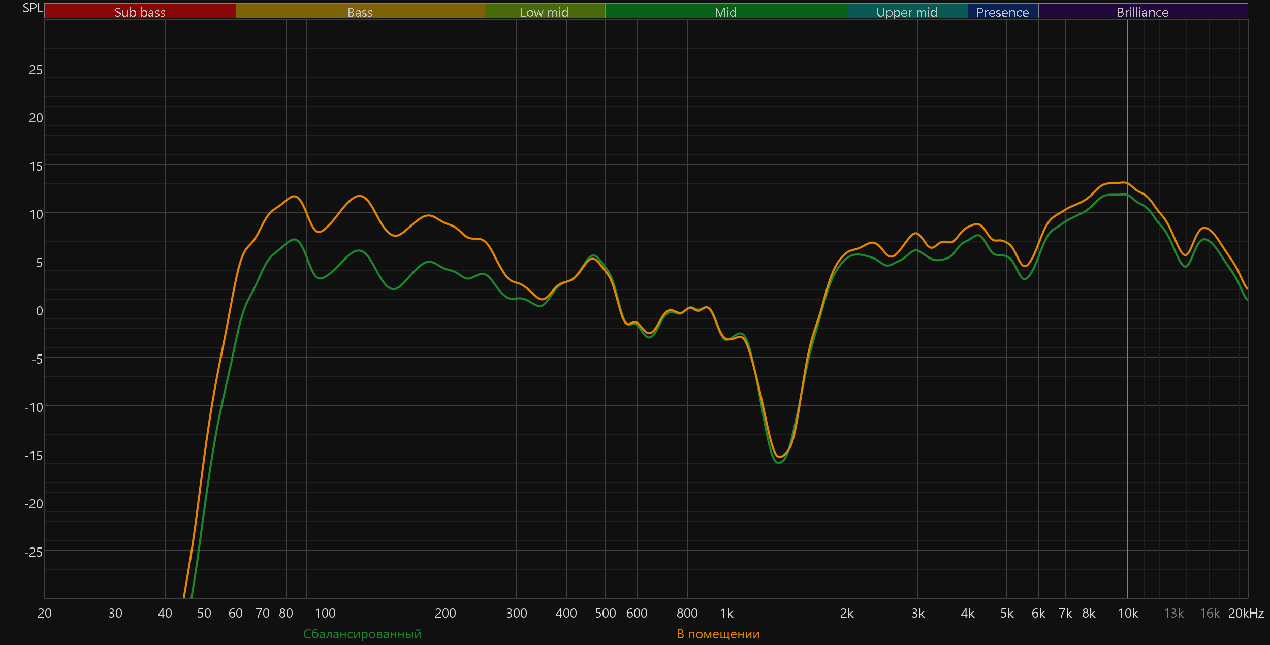 Высокие частоты постепенно восстанавливаются после провала, а в диапазоне 5—10 кГц заметен подъем. Потенциально он добавляет субъективной детализации и частично компенсирует провал в середине. Но на практике это чаще приводит к резкой и утомительной «верхастой» подаче, особенно заметной на громкости выше средней.
