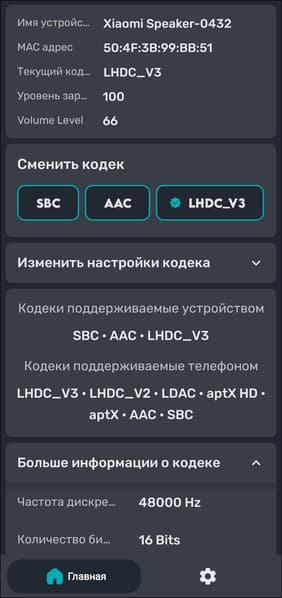 Все три заявленных кодека на месте — используемая утилита по-прежнему не умеет опознавать LHDC, но сам факт его наличия показывает. Параметр Bitpool у SBC ограничен значением 52, тогда как рекомендованный профиль High Quality подразумевает значение 51 — кодек отработает на максимуме своих возможностей и вряд ли станет «узким местом», ограничивающим качество звучания. Что же касается AAC, то его максимальный битрейт выставлен на уровне чуть выше используемых обычно 256 Кбит/с, которых более чем достаточно для компактной портативной акустики. Настройки LHDC мы дополнительно проверили с помощью ПО Bluetooth Codec Changer.