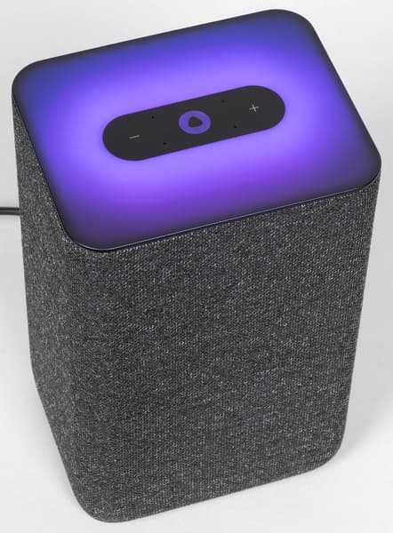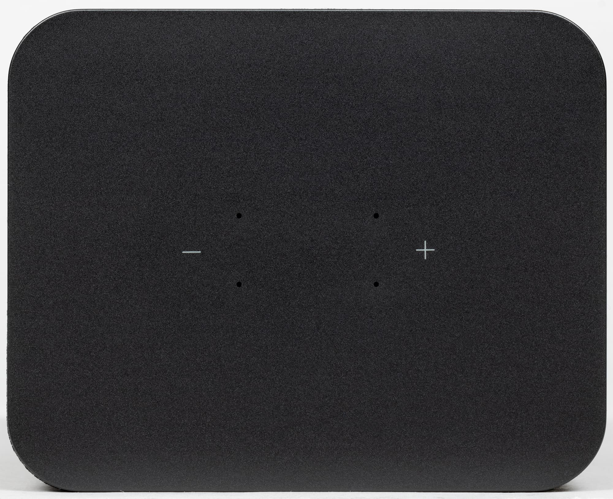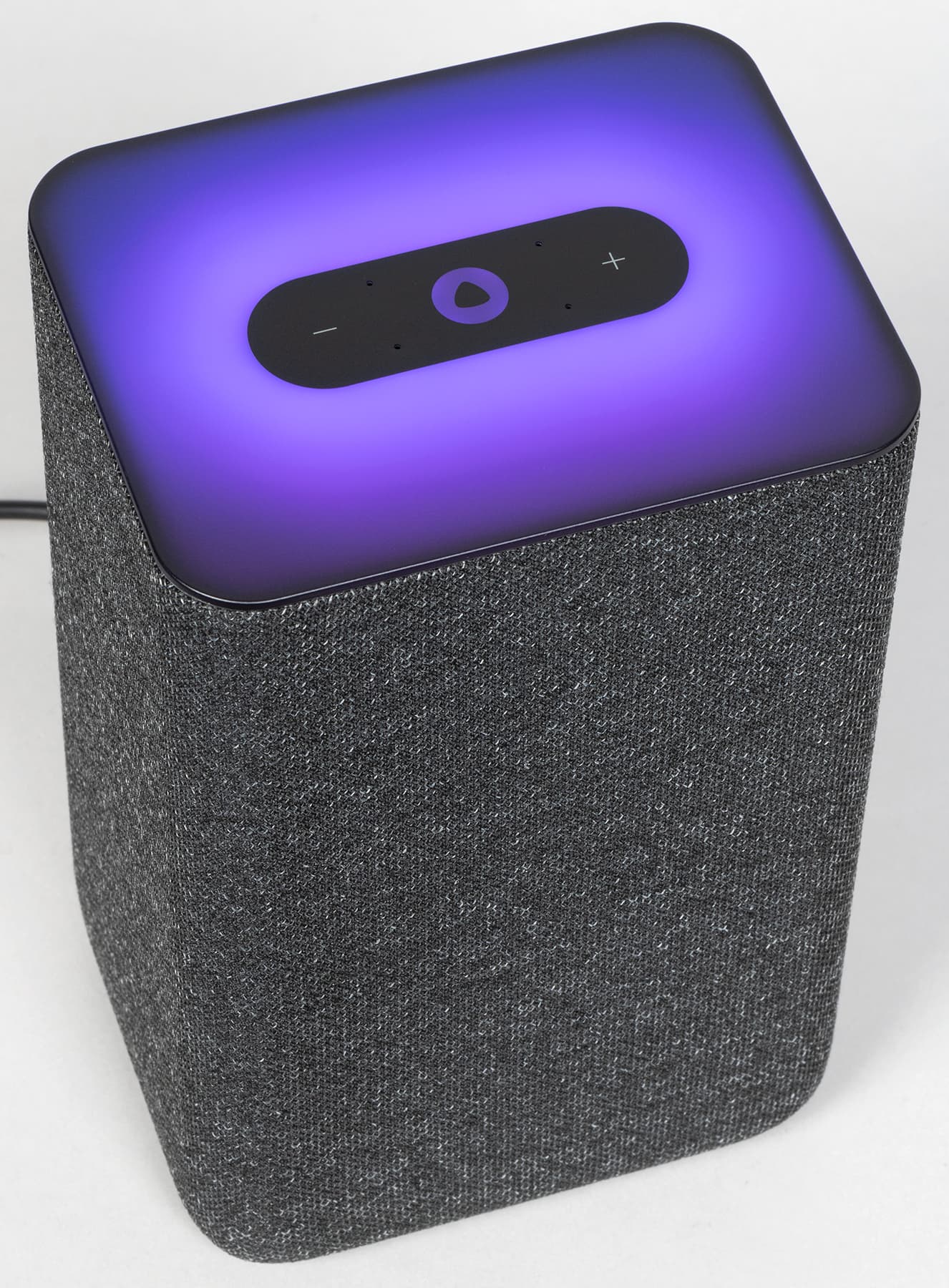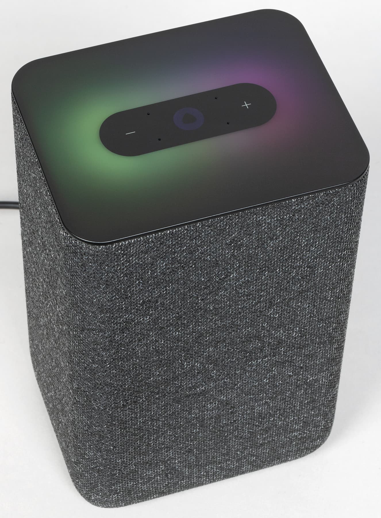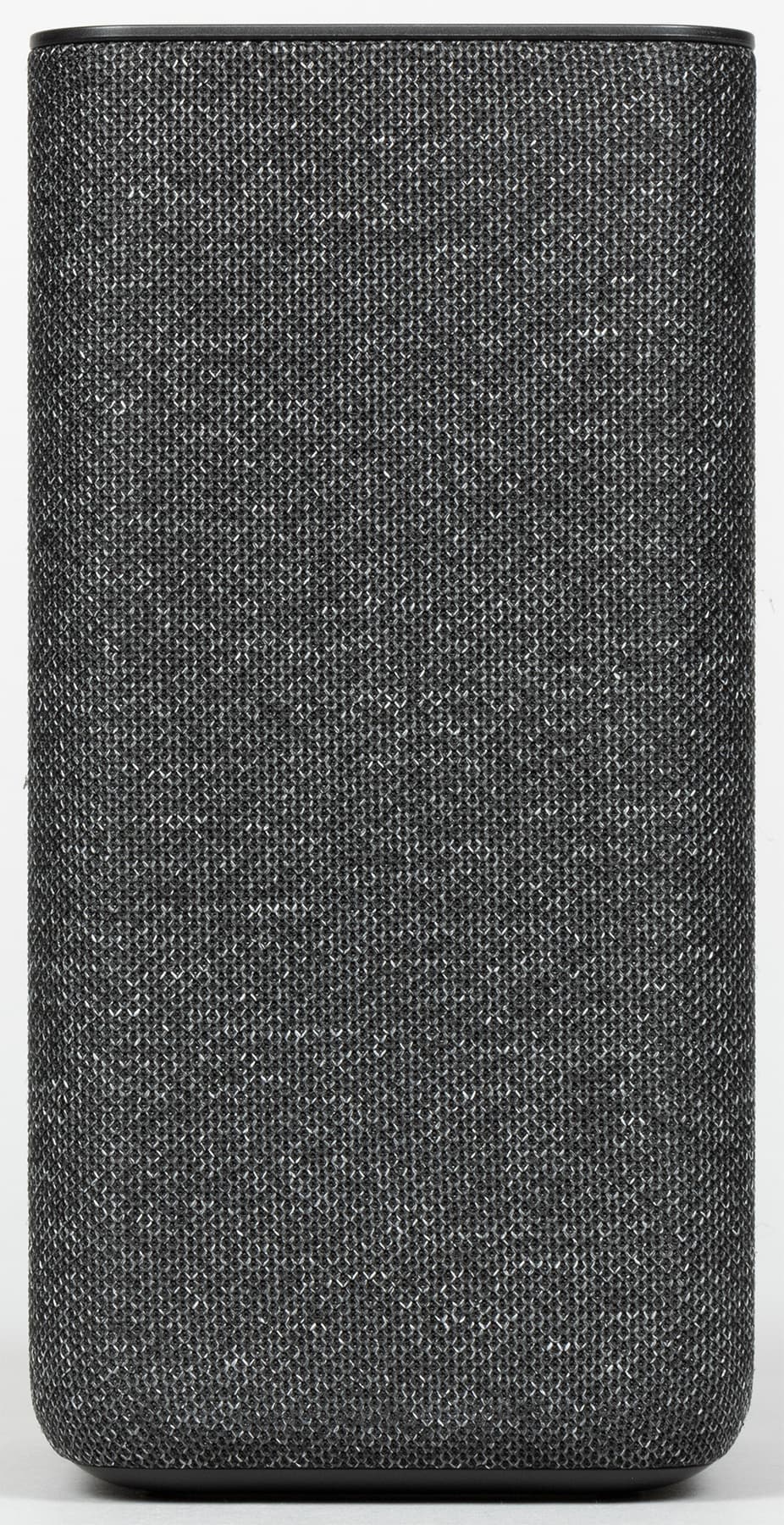 Колонка будет поставляться в четырех цветах: антрацит, кобальт, песочный и медный. Нам на тестирование достался первый — самый строгий и универсальный с точки зрения размещения в интерьере. Внешность у колонки на первый взгляд максимально лаконичная: просто обтянутый тканью прямоугольный параллелепипед.