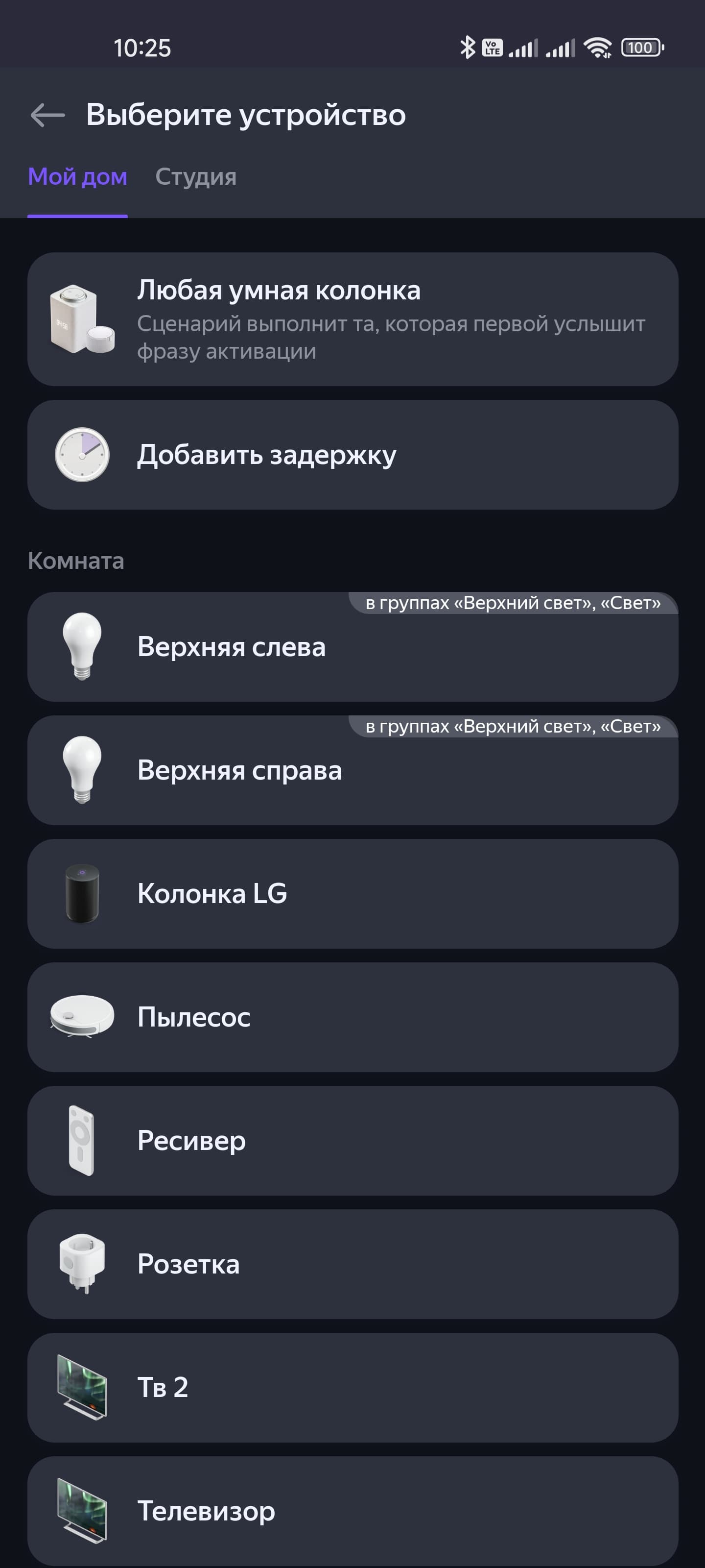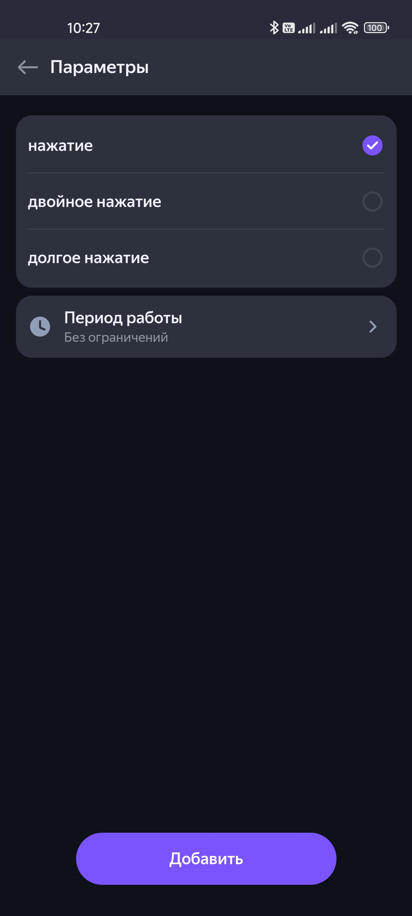 Выбираем устройство из списка — видим, что поддерживаются три типа нажатий: одиночное, двойное и долгое, на каждое можно «повесить» свое действие. Вариантов применения тут море, кнопка — штука полезная, много где пригодиться может. Можно использовать ее в качестве замены дверного звонка — при нажатии Алиса будет сообщать о том, что кто-то пришел, а заодно — включать свет в прихожей, например.