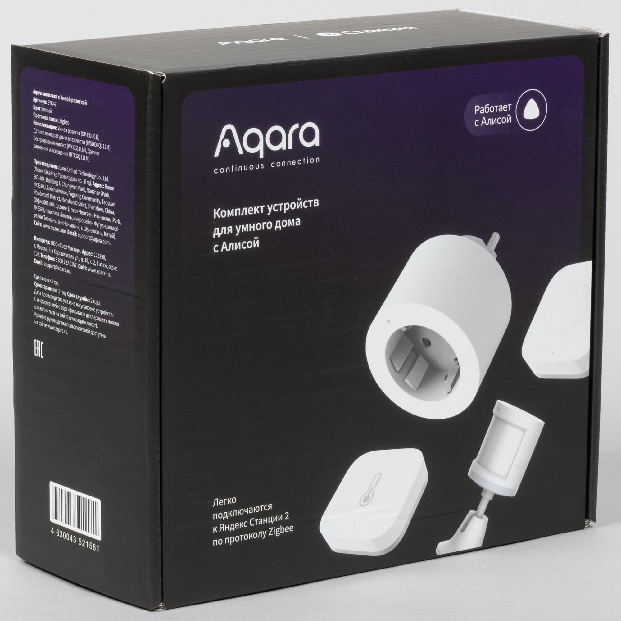 Вместе с новой «Яндекс Станцией 2» мы тестировали комплект устройств для «умного» дома Aqara, поставляемый в единой упаковке. Обычно в стартовые наборы входят всяческие лампочки и розетки — именно с них чаще всего начинается построение «умного» дома. Нам же достался комплект явно рассчитанный на тех, кто первые шаги уже сделал, а теперь хочет воспользоваться всеми преимуществами начала поддержки протокола Zigbee. В него вошли беспроводная кнопка, датчик температуры и влажности, датчик движения и освещения, ну и розетка — куда без нее. Про каждое из устройств скажем пару слов, а потом посмотрим, как они работают с «Яндекс Станцией 2».