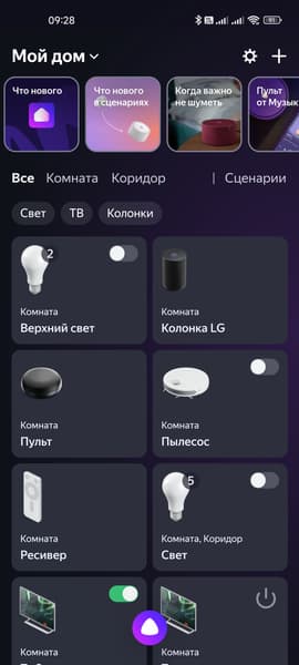 Как уже упоминалось выше, у экосистемы «умного» дома «Яндекса» наконец-то есть свое приложение — и пяти лет не прошло… Через браузер компании настройка тоже возможна, но там уже нет поддержки самых свежих функций, да и удобнее через отдельное приложение. В общем, устанавливаем, авторизуемся. И видим на главном экране все уже привязанные к аккаунту устройства. Сверху есть «плитка» из ссылок на материалы в формате «сториз», которые рассказывают про различные особенности нового ПО — есть смысл их почитать.