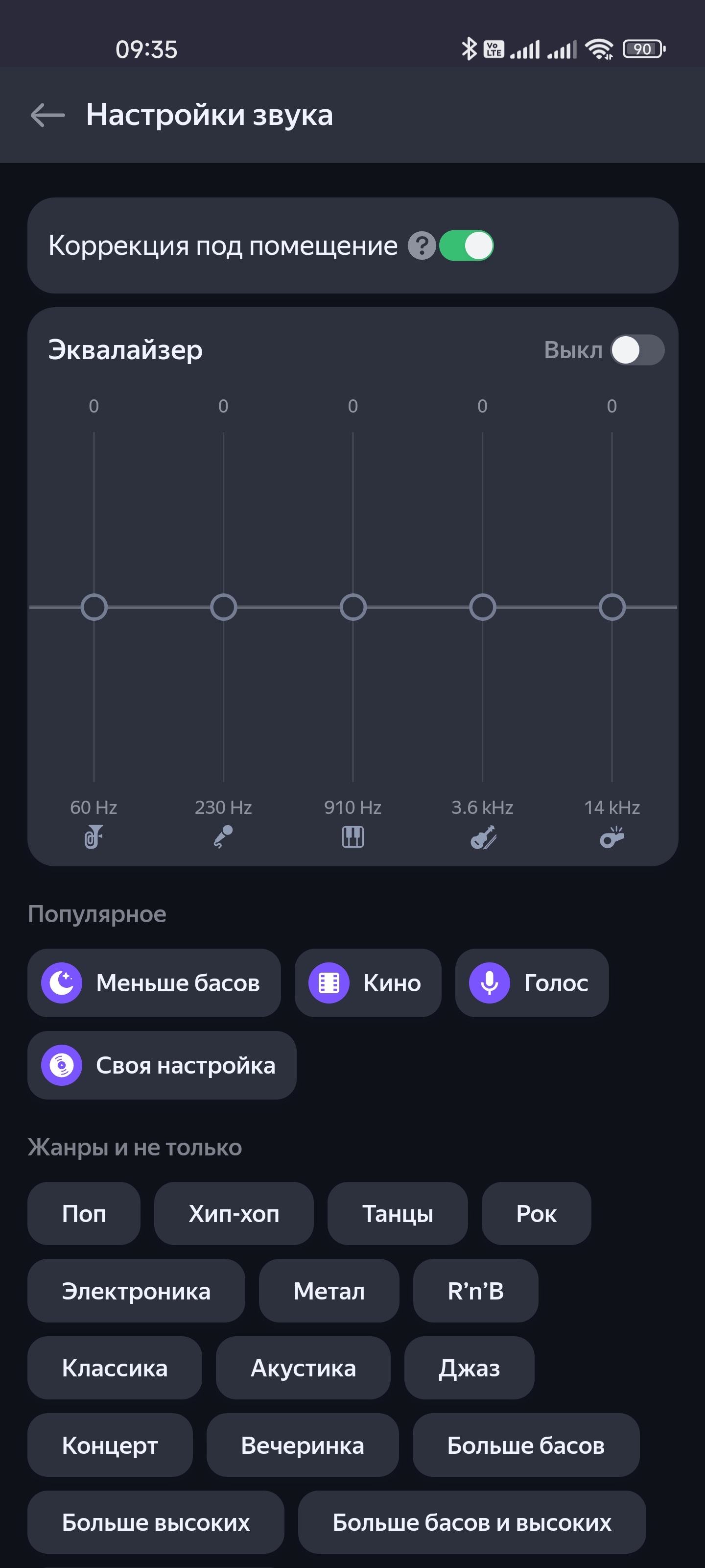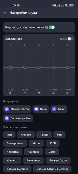 Ура, эквалайзер. Всего пять полос, но все равно очень здорово. Куча пресетов, возможность создавать свои — все как полагается. А еще есть функция автоматической коррекции звука под размеры и форму помещения, что вообще замечательно. Вот только при подключении посредством Bluetooth вся эта красота не работает — немного жаль, но колонка для рассчитанной на воспроизведение контента из собственного стримингового сервиса производителя, это вполне нормально.