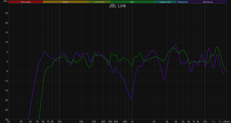 Как и заявлено производителем, воспроизведение баса стартует где-то от 65 Гц, для колонки такого размера с пластиковым корпусом это очень хороший показатель. Середина довольно-таки «ровная», в ВЧ-диапазоне есть ряд заметных пиков, но это не приводит к свойственным ему проблемам — никакого «цыканья» или «песка», все звучит довольно-таки комфортно. При этом нет гулкости, которую мы отмечали в звучании первой версии колонки, что заметно по графику кумулятивного затухания спектра (он же «водопад» или waterfall).