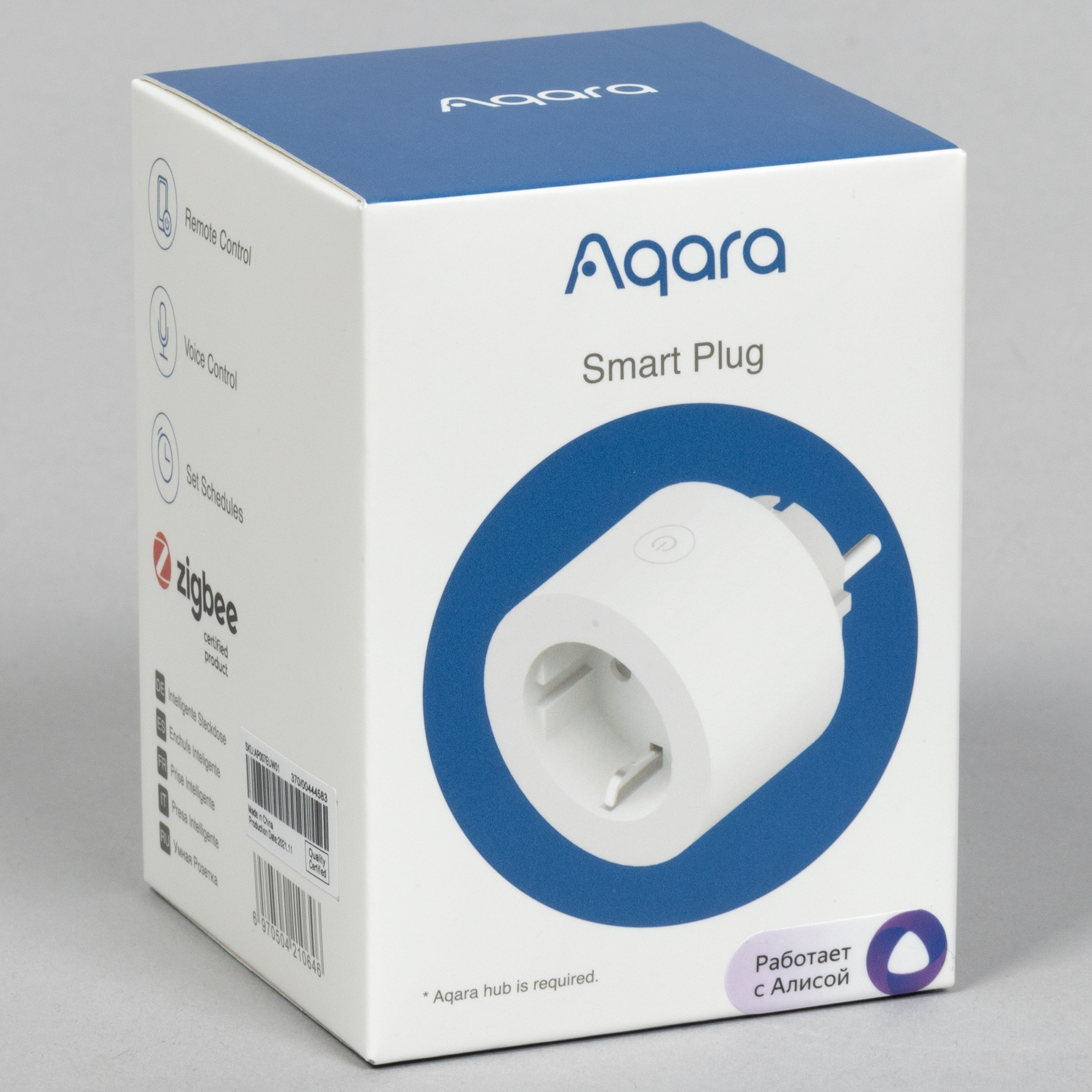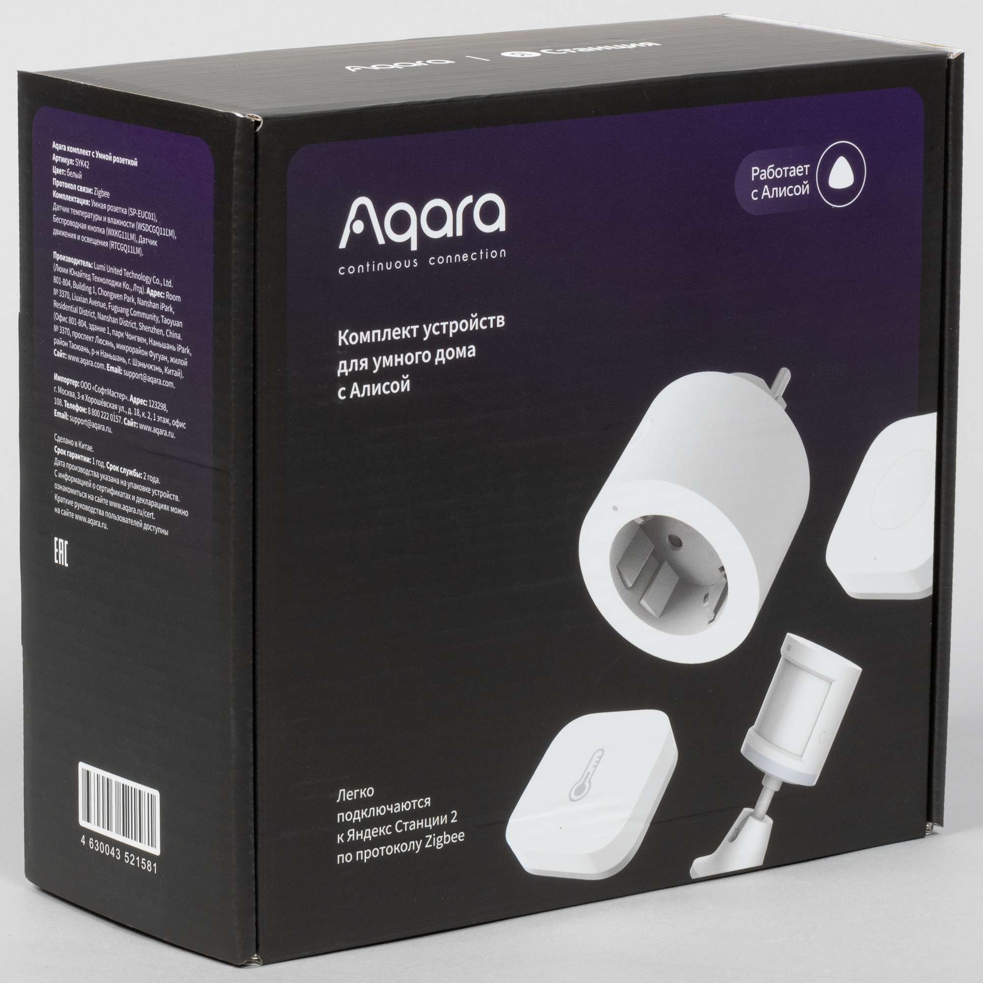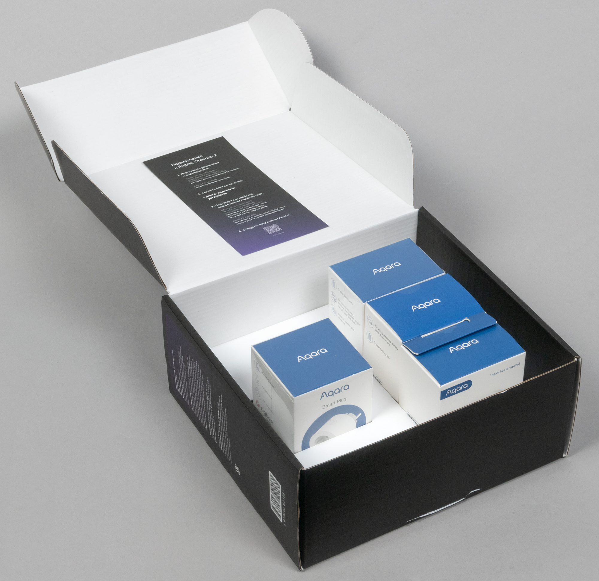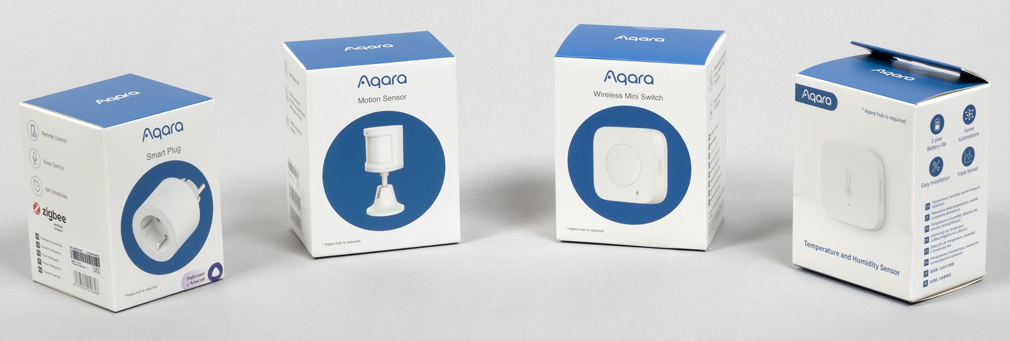 Оформлены все коробки в едином стиле, логотип Алисы почему-то есть только на одной из них — у остальных упоминается только поддержка протокола Zigbee.