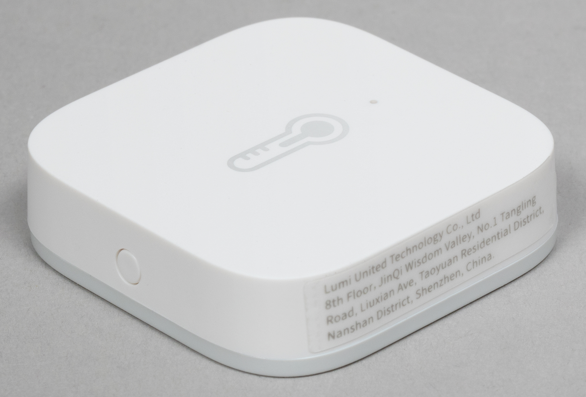 На верхнюю панель нанесена иконка термометра, под ней виден маленький светодиодный индикатор. На боковой части размещена кнопка соединения с Zigbee-хабом.