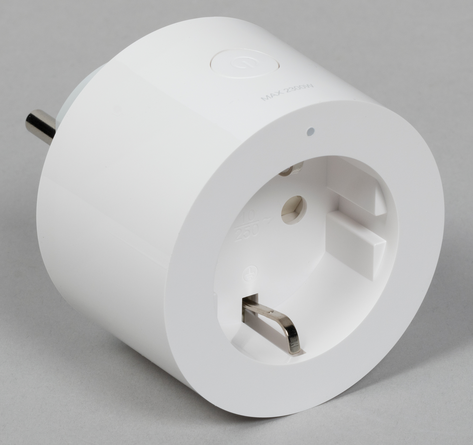 Диаметр у «умной» розетки довольно велик, при размещении в обычных розетках с несколькими гнездами она непременно закроет минимум пару. Но это беда подавляющего большинства таких устройств, тут уж ничего не поделаешь. В верхней части передней панели есть маленький индикатор работы, на боковой поверхности размещена кнопка включения, которая также отвечает за запуск сопряжения с хабом Zigbee.
