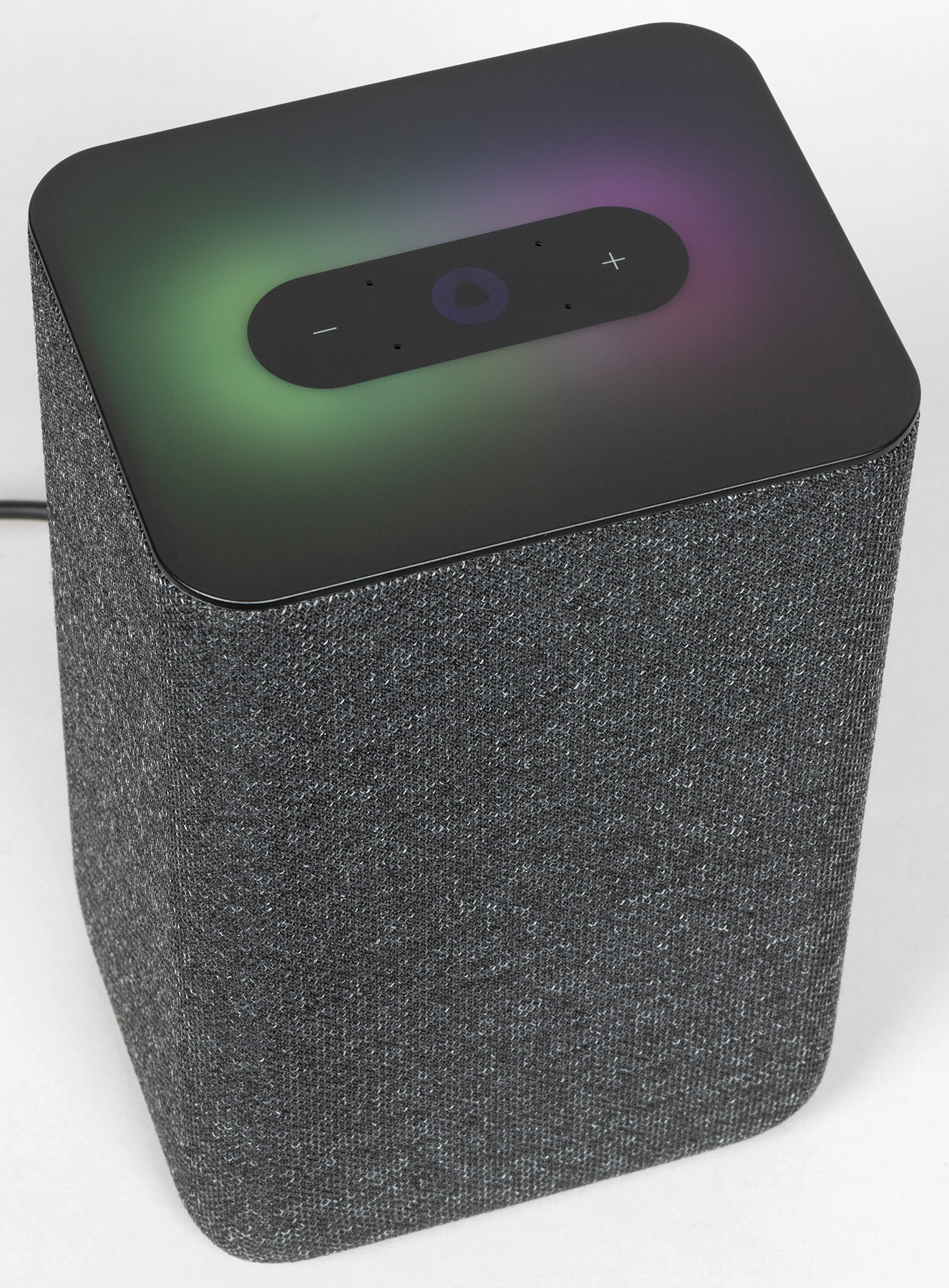 Но это только на первый взгляд. Стоит подключить колонку, как верхняя панель загорается яркой динамической подсветкой, которая выглядит просто крайне эффектно. Основные цвета — фиолетовый и оттенки синего, именно они используются для анимации «общения» с Алисой. При регулировке громкости цвет меняется от зеленого до красного. Но самое красивое — это, конечно, световые эффекты при воспроизведении музыки. Вот уж где верхняя панель показывает себя во всей красе.