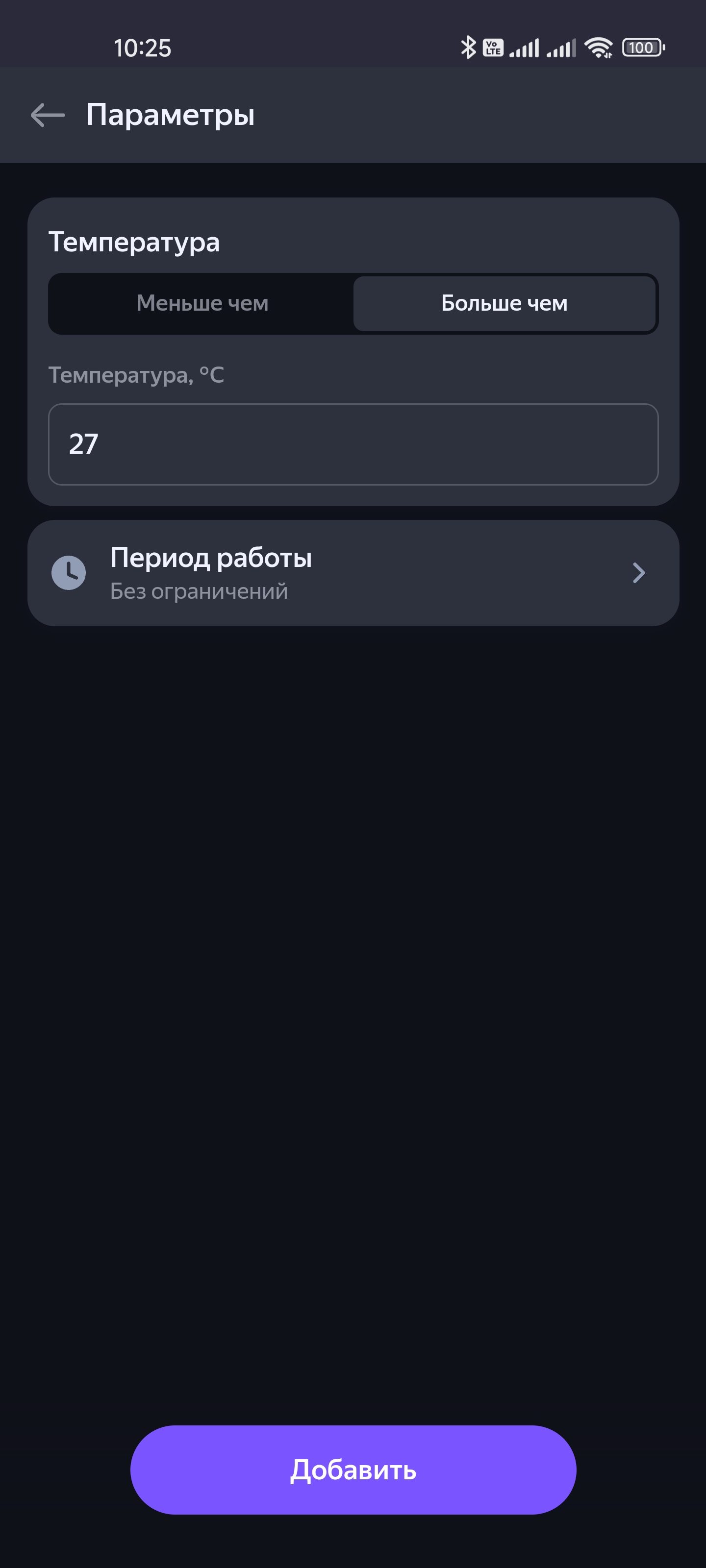 Но самое интересное тут, конечно, возможность использовать датчик в качестве триггера для сценариев. Переходим на страницу сценариев, жмем на кнопку добавления условия — выбираем датчик климата. Например, настроим срабатывание при температуре выше 27 градусов. Ну а дальше выбираем любое из устройств и говорим ему, что сделать — можно хоть свет включить, хоть телевизор выключить… Но логичнее, конечно, будет запустить кондиционер.